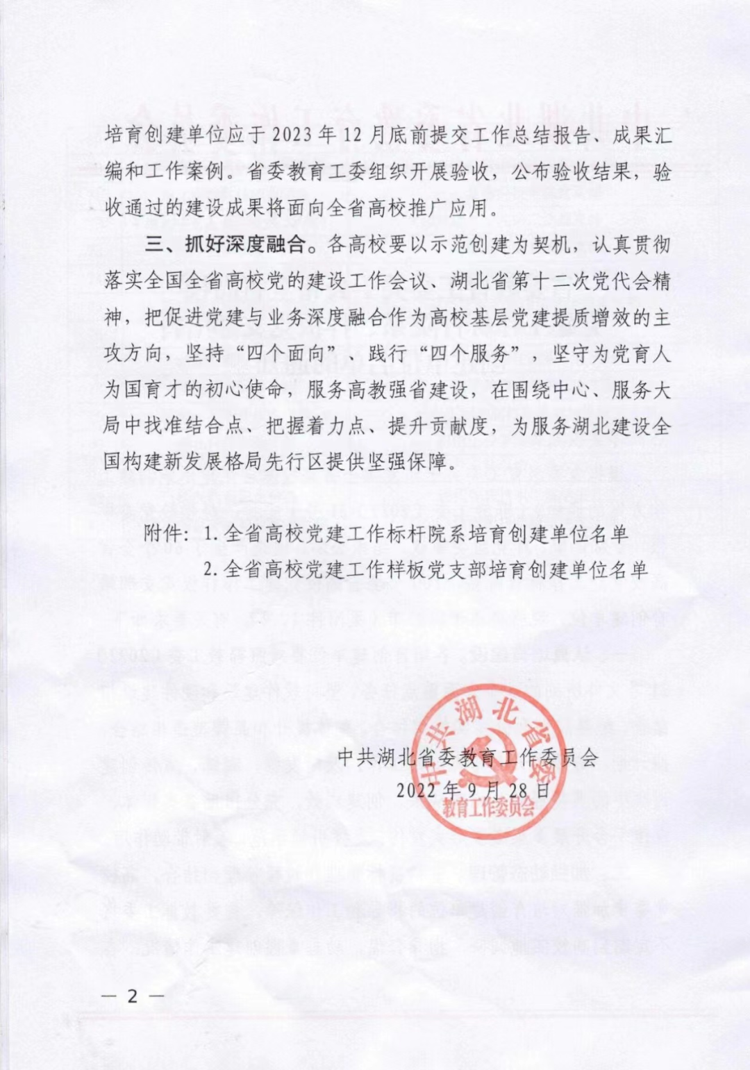 近日,湖北省委教育工委公布了全省高校基层党建示范创建名单,共遴选产生60个院系党组织、100个党支部分别作为全省高公司党建工作标杆院系、样板支部培育创建单位。公司党总支部入选“全省高公司党建工作标杆院系”培育创建单位。