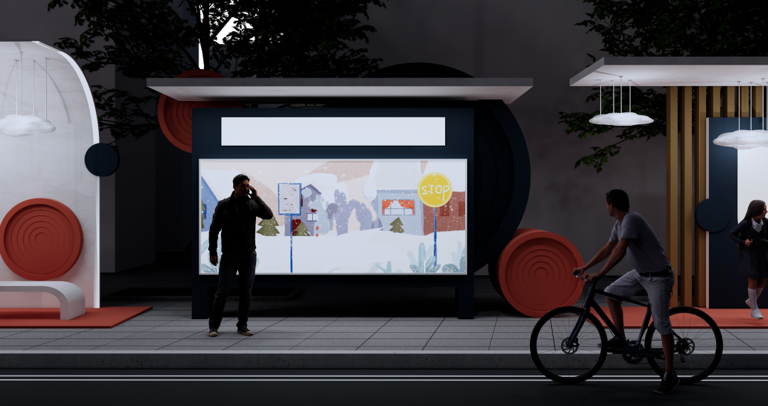 关于设计的理念,刘俊辉同学向我们阐述:“这个公交车站设计的初心就是实用,并且兼具一定的观赏性,在候车的过程中能使人的心情有一定的放松。候车站台整体形态简约,看起来干净利落,站牌的设计也更加全面,使用的是LED显示屏,站牌上不仅有路线指示,还有天气、路况方面的内容,并且还加入了语音播报、车辆到站动态等更具有人性化的设计,使尚不认字的小孩或者老人盲人都能得到帮助。为了满足老人、小孩、孕妇、残障人士及需要休息的乘客的需求,在公交站候车区设置了座椅。灯光采用的也是LED灯,比普通荧光灯节能百分之七十五,柔和的灯光还可以保护视力,而且LED灯光系统采用12伏电源驱动,即使漏电也不会对人体有伤害。”