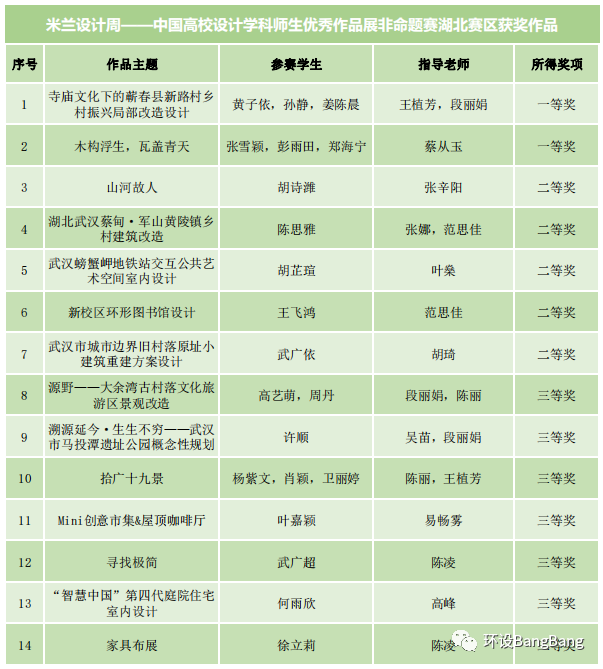 2022年5月,2022年“米兰设计周——中国高校设计学科师生优秀作品展”(湖北赛区)获奖结果正式公布,304永利集团报送的《寺庙文化下的蕲春县新路村乡村振兴局部改造设计》(作者:黄子依、孙静、姜陈晨,指导老师:王植芳、段丽娟)和《木构浮生,瓦盖青天》(作者:张雪颖、彭雨田、郑海宁,指导老师:蔡从玉)获一等奖,另有5件作品获二等奖,7件作品获三等奖。涵盖园林、风景园林、环境设计、艺术设计多个专业。