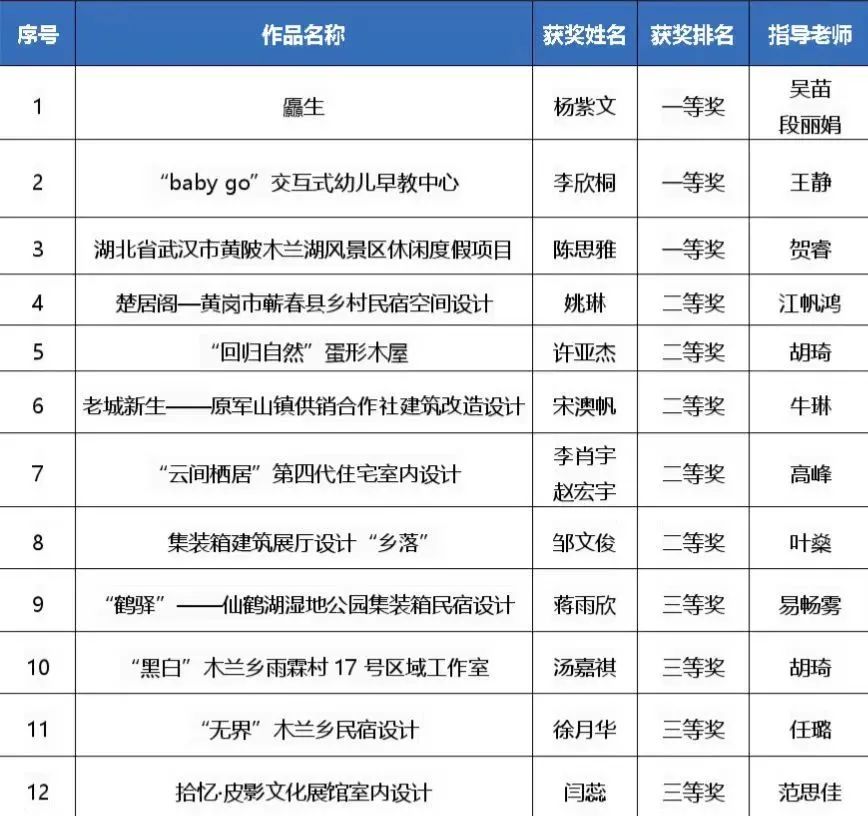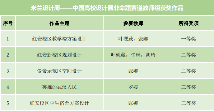 公司教师团队作品《红安校区教学楼方案设计》(作者:叶砚蒇、张娜)获省赛一等奖、国赛二等奖;教师团队作品《红安新校区规划设计》(作者:叶砚蒇、牛琳、胡琦)获省赛二等奖、国赛三等奖;教师个人作品《红安校区员工宿舍方案设计》(作者:张娜)获省赛三等奖。