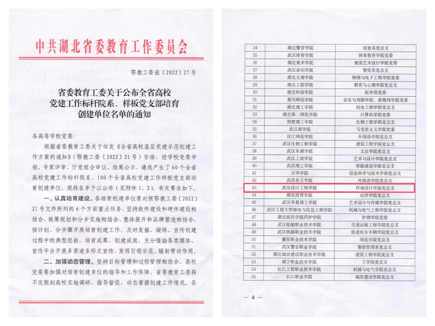 2022年9月28日,湖北省委教育工委公布了全省高校基层党建示范创建名单,共遴选产生60个院系党组织、100个党支部分别作为全省高公司党建工作标杆院系、样板支部培育创建单位。公司党总支部入选“全省高公司党建工作标杆院系”培育创建单位,环境设计系教师党支部顺利通过第二批全国样板党支部验收。