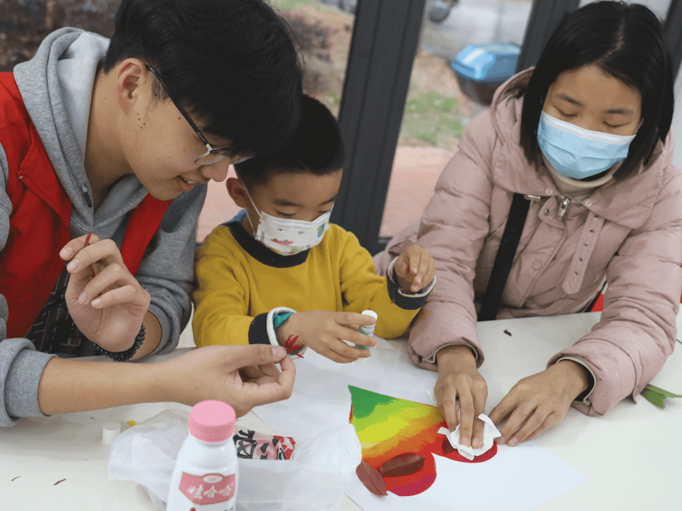 活动前志愿者们提前在社区内寻找了五颜六色的植物,然后准备活动所用到的工具:双面胶、固体胶、打印好的彩色图案等。志愿者小老师还带着小朋友们玩了“击鼓传花”调动小朋友参与集体活动的积极性,激发小朋友们的活动兴趣。