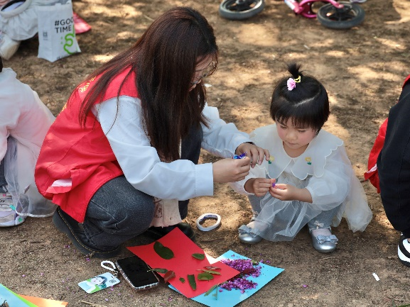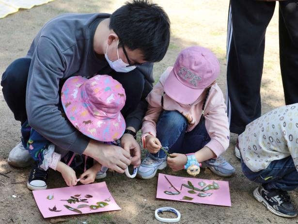 活动开始后有每个志愿者带领一位小朋友去寻找代表钟表数字的树叶和代表时针分针的小树枝。小朋友们挑选自己喜欢的树叶来布置自己的自然钟表。