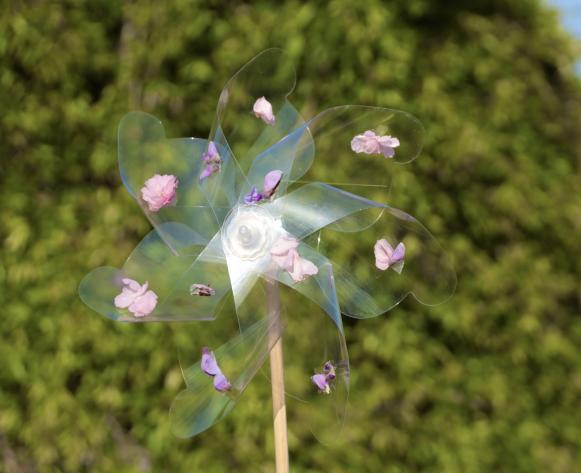 在志愿者、小朋友以及家长们三方努力下,我们将事先准备好的小风车组件拼好,然后再用双面胶把采摘好的小花朵、树叶粘贴到小风车上,拼接成小朋友们心中的图案。