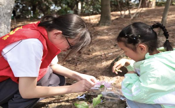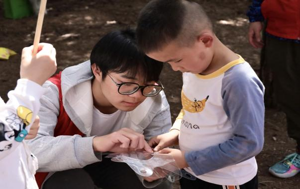 活动开始的时每个小朋友都和自己的志愿者小老师组成团队,然后由志愿者们带着小朋友去公园里寻找漂亮的树叶与花朵来装饰自己的小风车。
