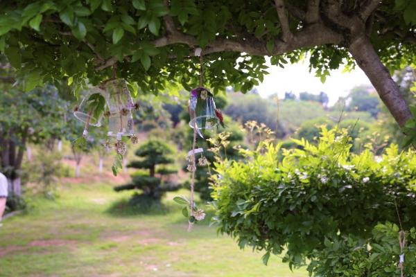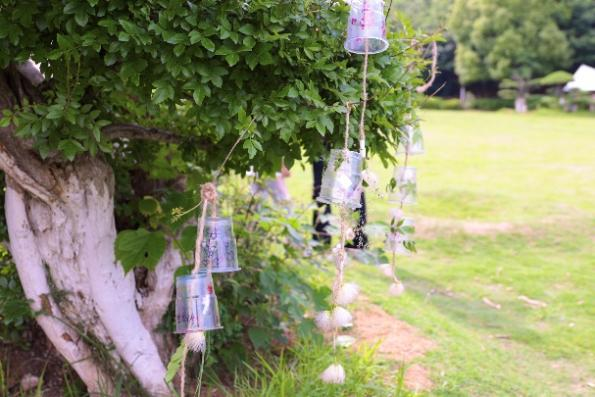 风铃完成后,小朋友们将风铃挂在树上,一阵风吹过,看着风铃随风摇曳。有的小朋友还在风铃上写下了自己的名字和祝福,不知道是在许下什么美好的愿望呢。