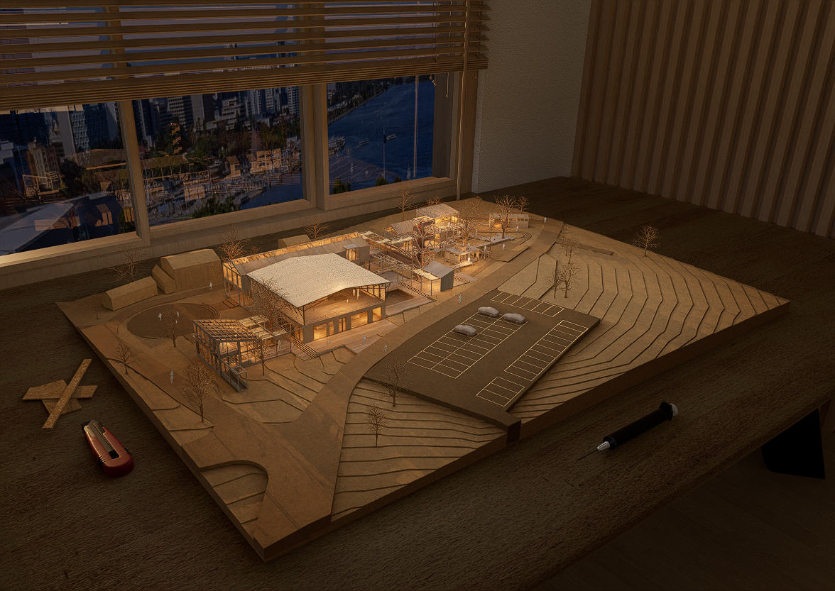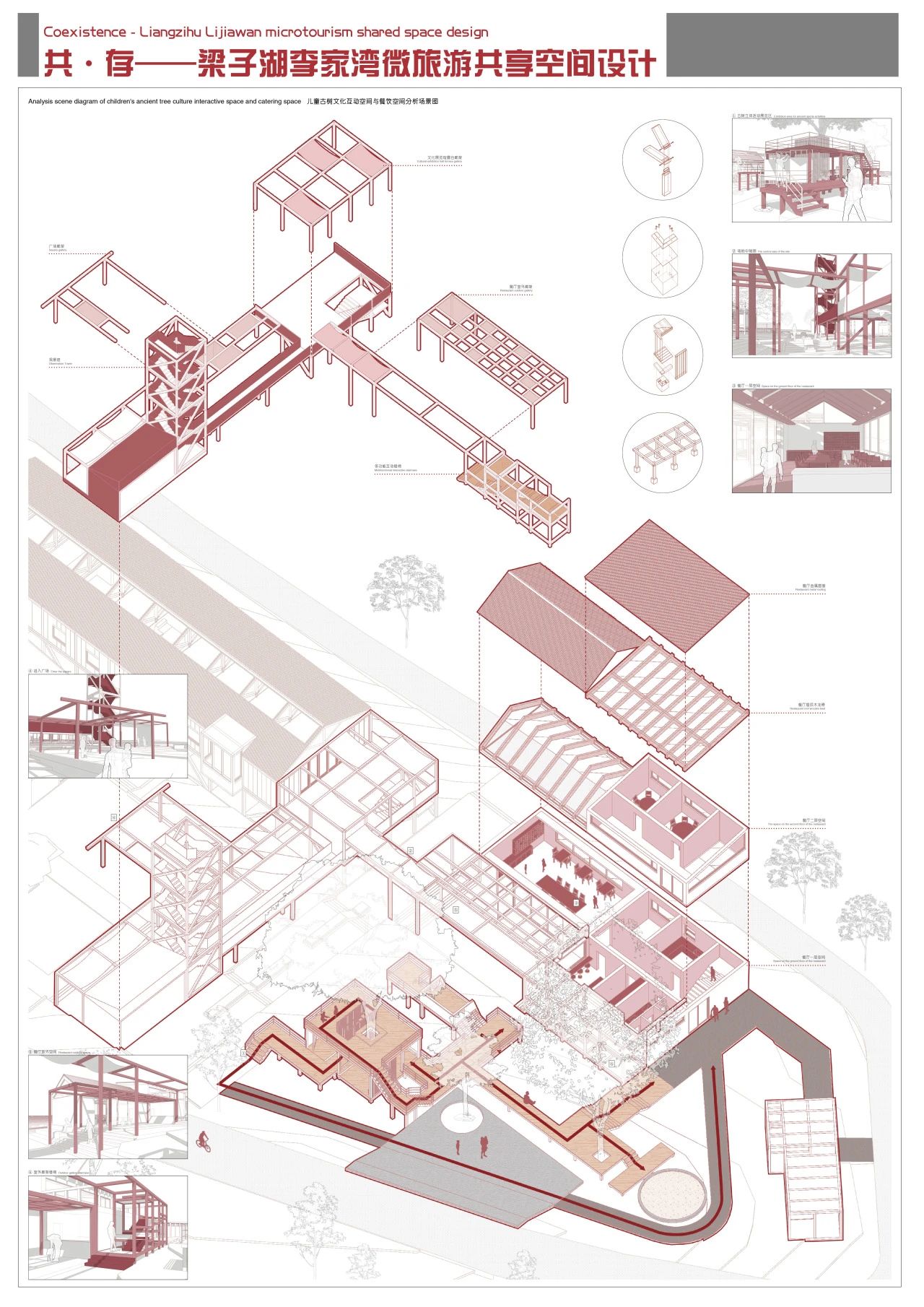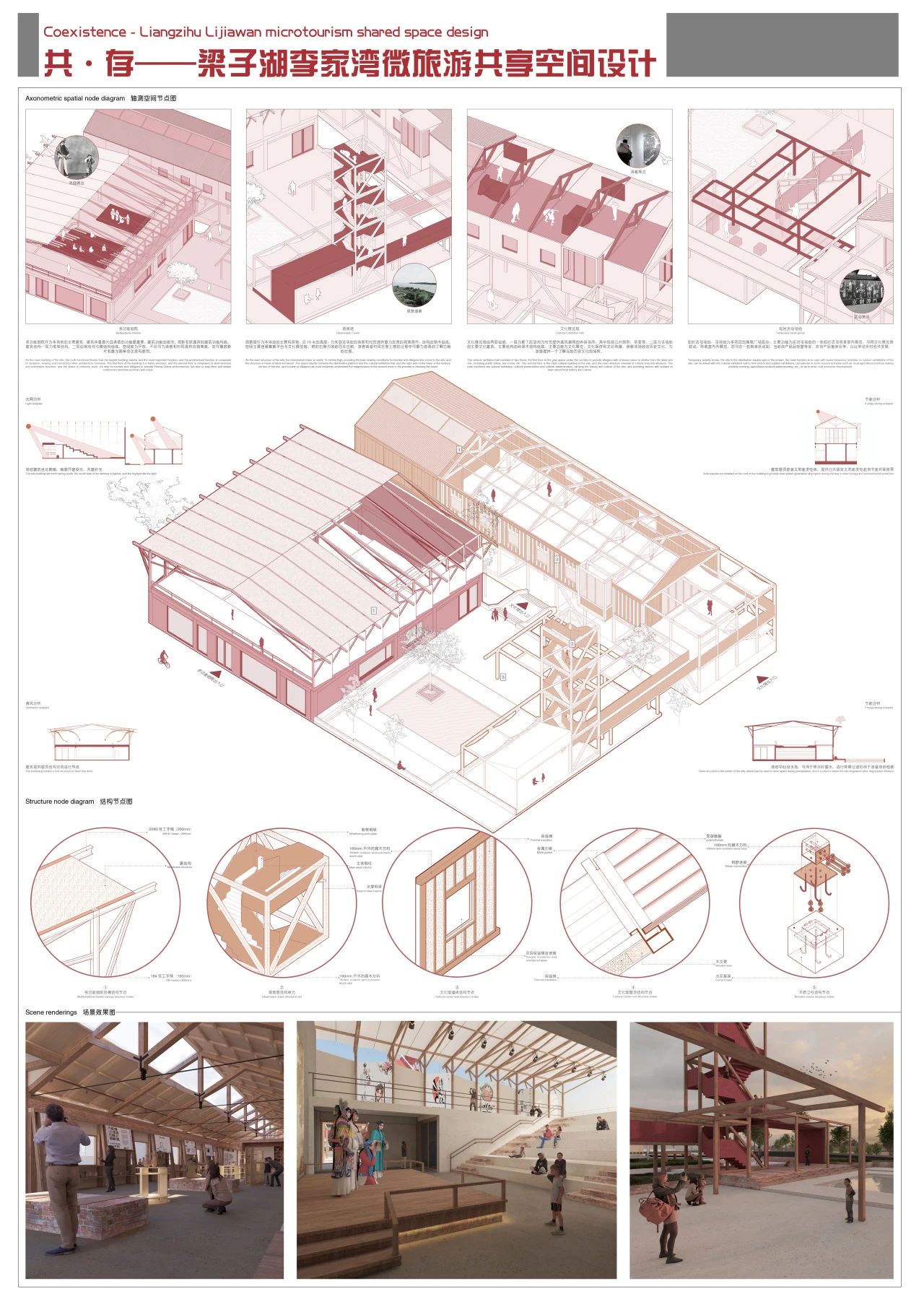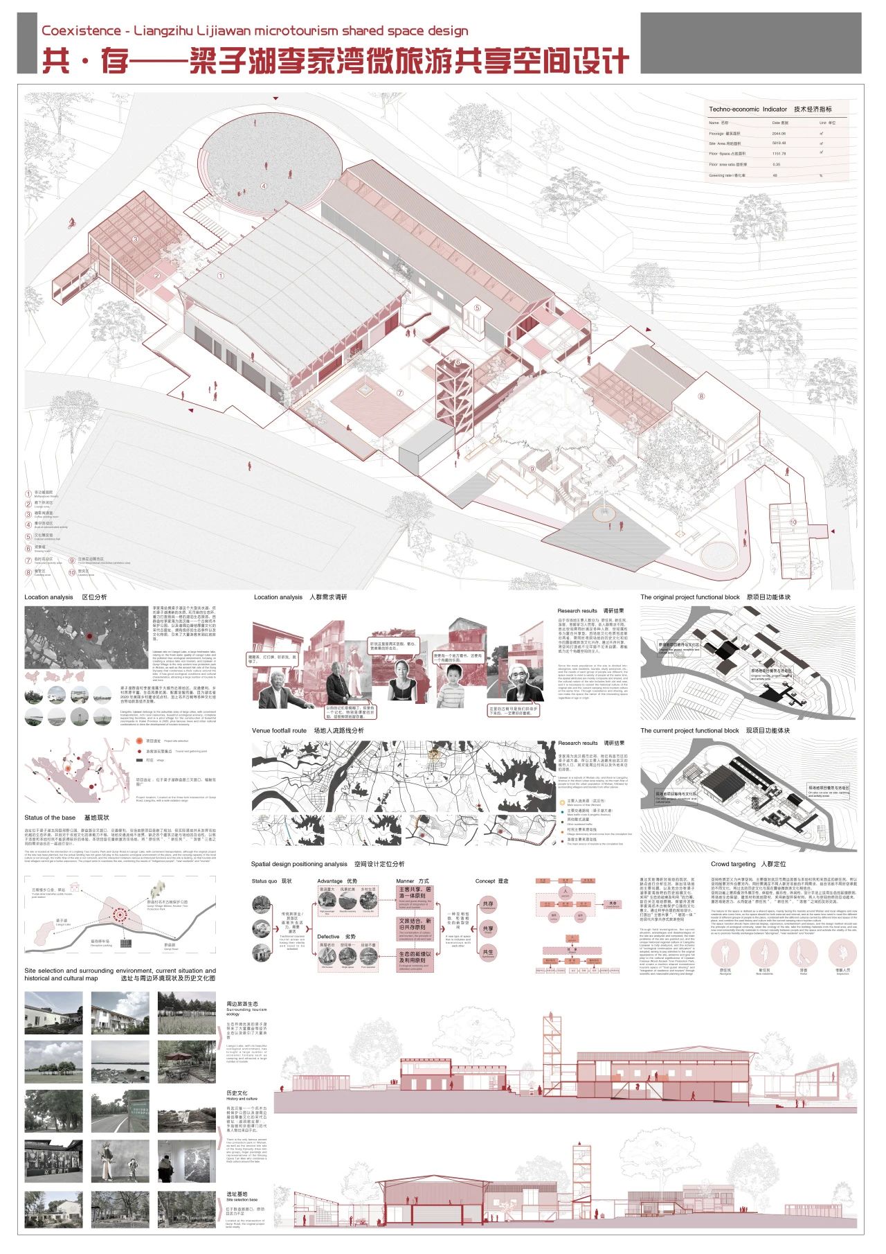 本项目位于武汉市梁子湖旅游风景区李家湾,目的在于重新构建“原住民、新住民、游客”三者融合的新型空间。项目设计基于场地的生态地貌、融入当地的历史文化,并且将共享理念与村落自身文化、自然等资源相结合,营造“主客共享”的乡村共享融合空间。设计利用场地自身的高差,搭配更具互动性的交通流线、半开放式的场地,使其场地的游憩效果更具层次感、参与感以及观赏价值。建筑功能包括基础的游客接待空间、当地文化传播空间、满足亲子互动以及阅读的共享休闲空间。通过创造多样化的场地空间形式,以激发场地的活力,从而促进游客和村民以及游客与村落之间的友好交流,打造以时代记忆与当代生活方式共存的共享融合空间。