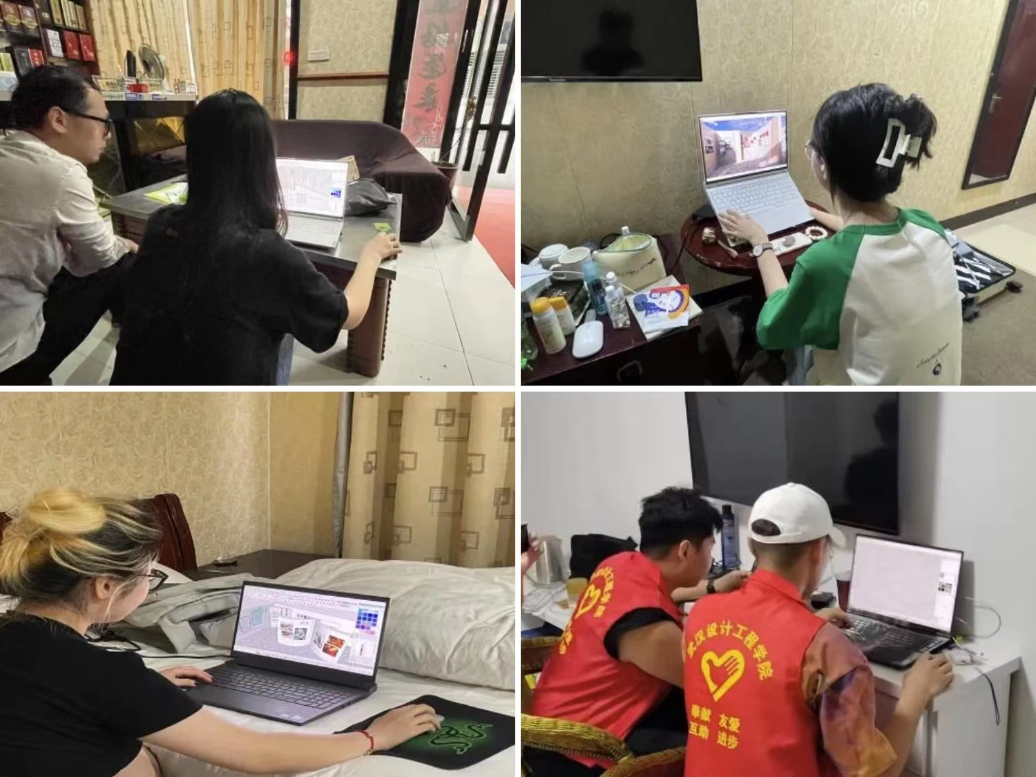 在墙绘的前期准备工作中,同学们首先对墙体进行了实体勘察,发现马踏石村的墙面有多处画面明显脱落并且有划痕需要修复,经过老师和村书记的协商,对其采取方案和措施进行图片复原以及重新规划,为之后墙面处理和底稿等工作做好了充足的准备。实体勘测后,同学们一刻也不停歇,纷纷打开电脑,利用休息的时间设计出效果图。