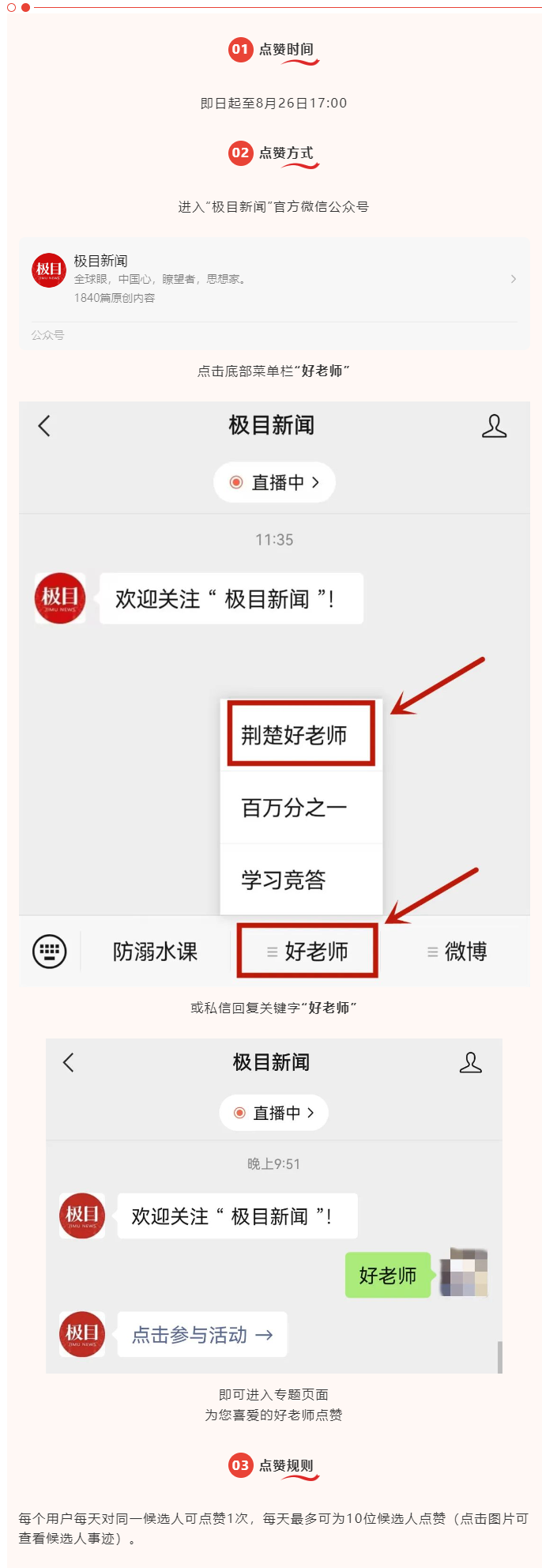 关注“极目新闻”,进入“荆楚好老师”栏目,搜索“B22”。即日起至8月26日,每人每天投一次。