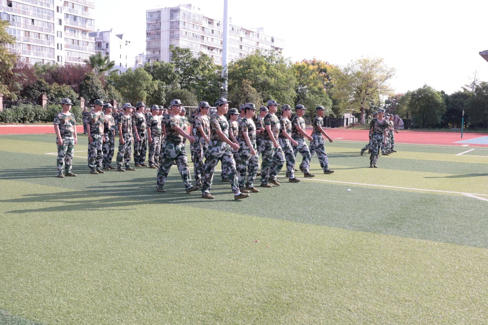 “稍息!立正!”“向左转!向右转!”整齐的队伍,一致的衣着,铿锵有力的口号,少年们神采奕奕,展现出环设学子的青春风采。第一天或许很疲惫,但这一切融进蔚蓝的天空和开阔的操场里,却显得那么热烈!