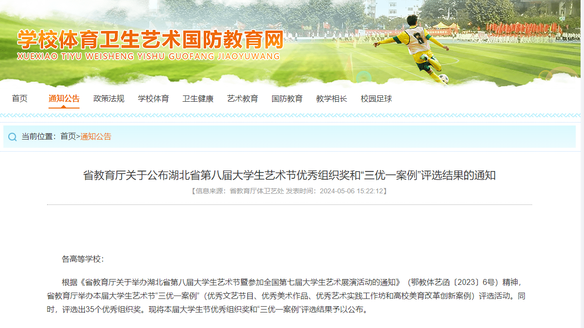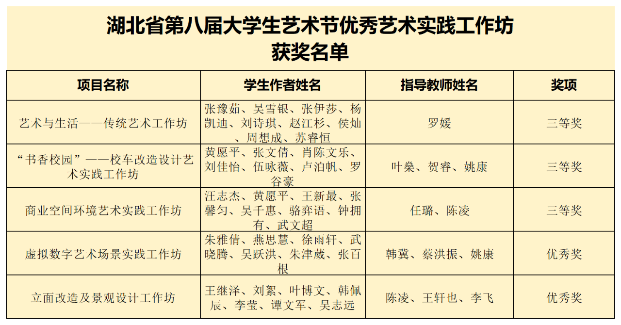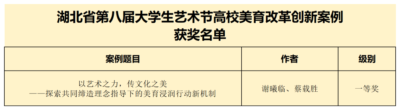 5月6日,湖北省第八届老员工艺术节“三优一案例”评选结果揭晓,公司师生创作作品积极参选,一举斩获多个奖项!其中公司书记谢曦临和公共艺术设计公司教师蔡载胜联合申报的高校美育改革创新案例《以艺术之力,传文化之美——探索共同缔造理念指导下的美育浸润行动新机制》荣获高校美育改革创新案例一等奖!