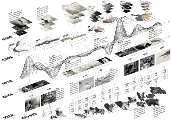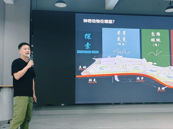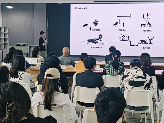 分享会上,张老师详述了整个项目的心路历程和与园方沟通的难点,从“人与动物的关系”介绍了园区功能分区、路径分析、互动体验、景观设计等。张老师将项目融入教学实践,介绍了他指导的毕业作品“猛兽幻区”,员工在实际项目的基础上,引入电影的空间叙事,选定《少年派的奇幻漂流》进行场景拆解,进行平面草图、实体模型、SU建模、AI渲染及部分实体模型打印,最终完成了优秀的毕业作品。