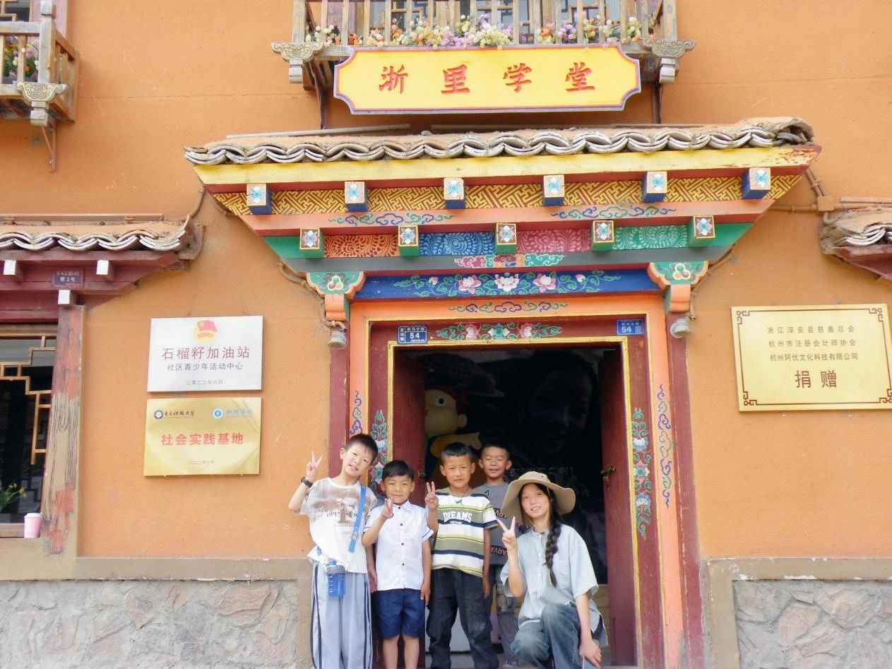 图为队员和藏族小朋友在浙里学堂前合照