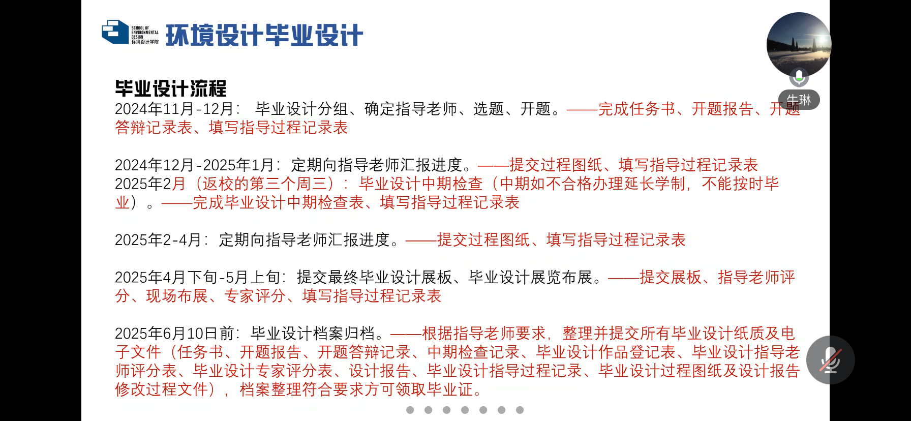 随后,牛琳、戴欢和张路实老师分别以304永利集团各专业2024届毕业设计为参照进行讲解,梳理了毕业设计目的、设计任务以及依据文件,展示了毕业设计要求,公布了毕业设计流程及相关重要时间节点。
