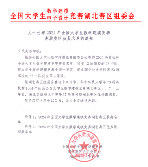 该竞赛创办于1992年,每年一届,是首批列入“高校学科竞赛排行榜”的19项竞赛之一,目前已成为全国高校规模最大的基础性学科竞赛、世界上规模最大的数学建模竞赛。2024年,来自全国及美国、英国、澳大利亚、新加坡、马来西亚的1788所院校/校区、65761队(本科59278队、专科6483队)、近20万人报名参赛。湖北赛区有来自华中科技大学等73所高校的1064个队参与了该项比赛。