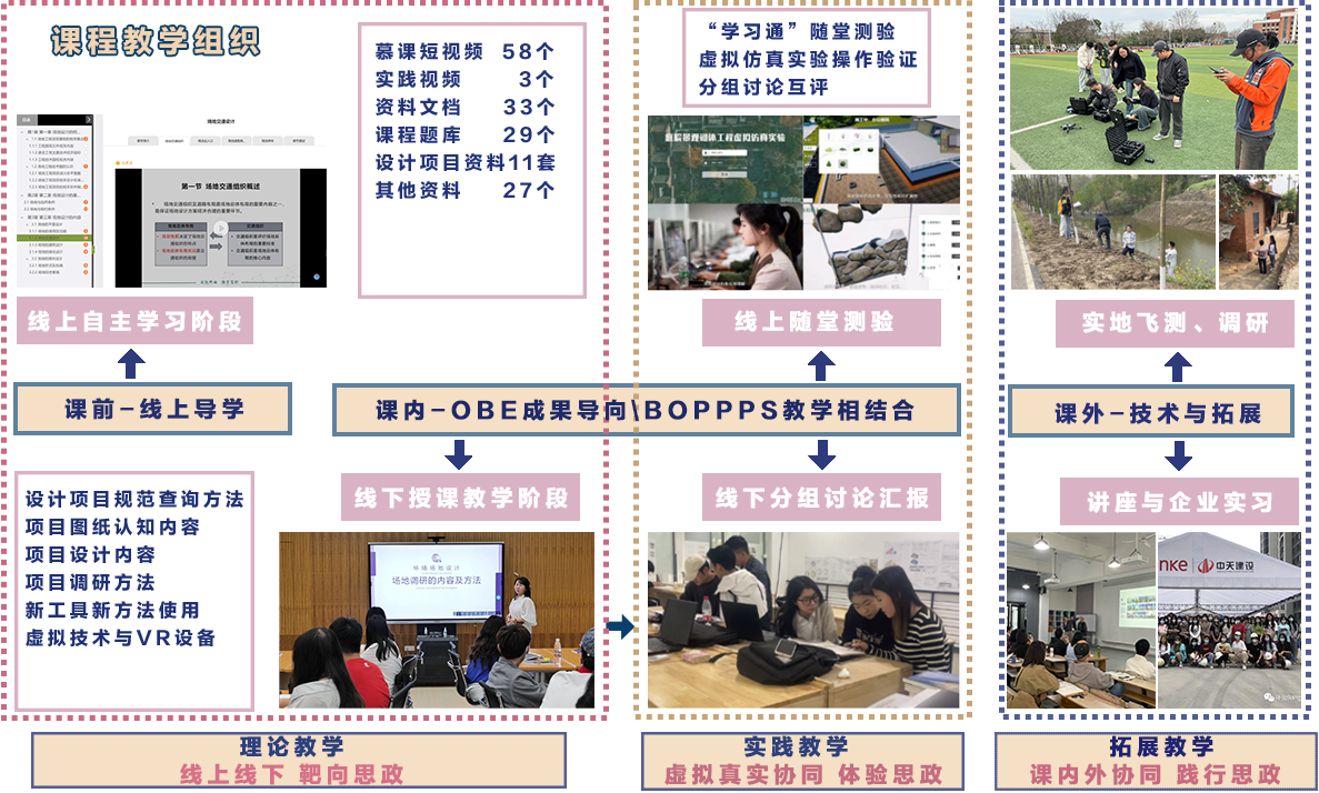 《环境设计场地2》课程以成果为导向,将项目设计流程与相关的知识点结合,明确员工需要掌握的核心原理、方法和技能。课前利用在线平台提供学习资源,将易查易学的基础知识让员工根据设计项目的需要进行自主学习。课内设置分组讨论、在线测试、作业互评、项目协作等,加强员工之间的合作与交流,共同解决问题。课程的教学改革在国家和美乡村、城市更新建设的政策背景下推进“数字化赋能教学质量提升”,注重学习方法,将基础理论知识与专业素养用到实处。在实际场地项目的条件上进行知识的应用,明确设计岗位内容,找到合适员工自己的设计前、中、后期对应的岗位。紧跟国家“数字化”教学改革步伐,运用新工具、新方法来解决教学模式单一、教学方法陈旧等问题。