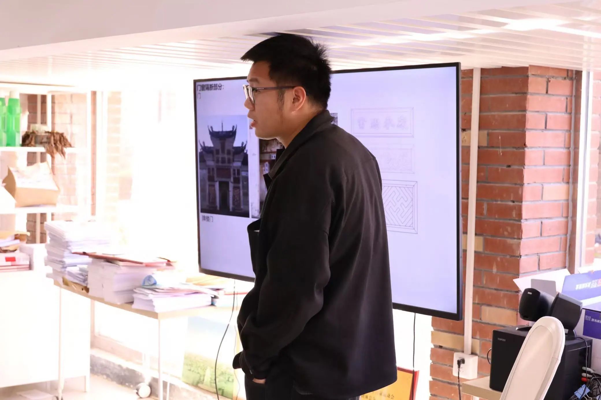 随后,余老师从屋面山墙、梁枋立柱、门窗栏杆三个方面,逐层解析了吴氏祠的建筑装饰艺术特点。吴氏祠的屋面山墙采用了传统的硬山顶设计,展现了明清时期工匠的高超技艺;而梁枋上的彩绘和雕刻图案则丰富多样,体现了深厚的文化底蕴。余老师鼓励同学们借鉴这些手法,探索新的文化表达形式。