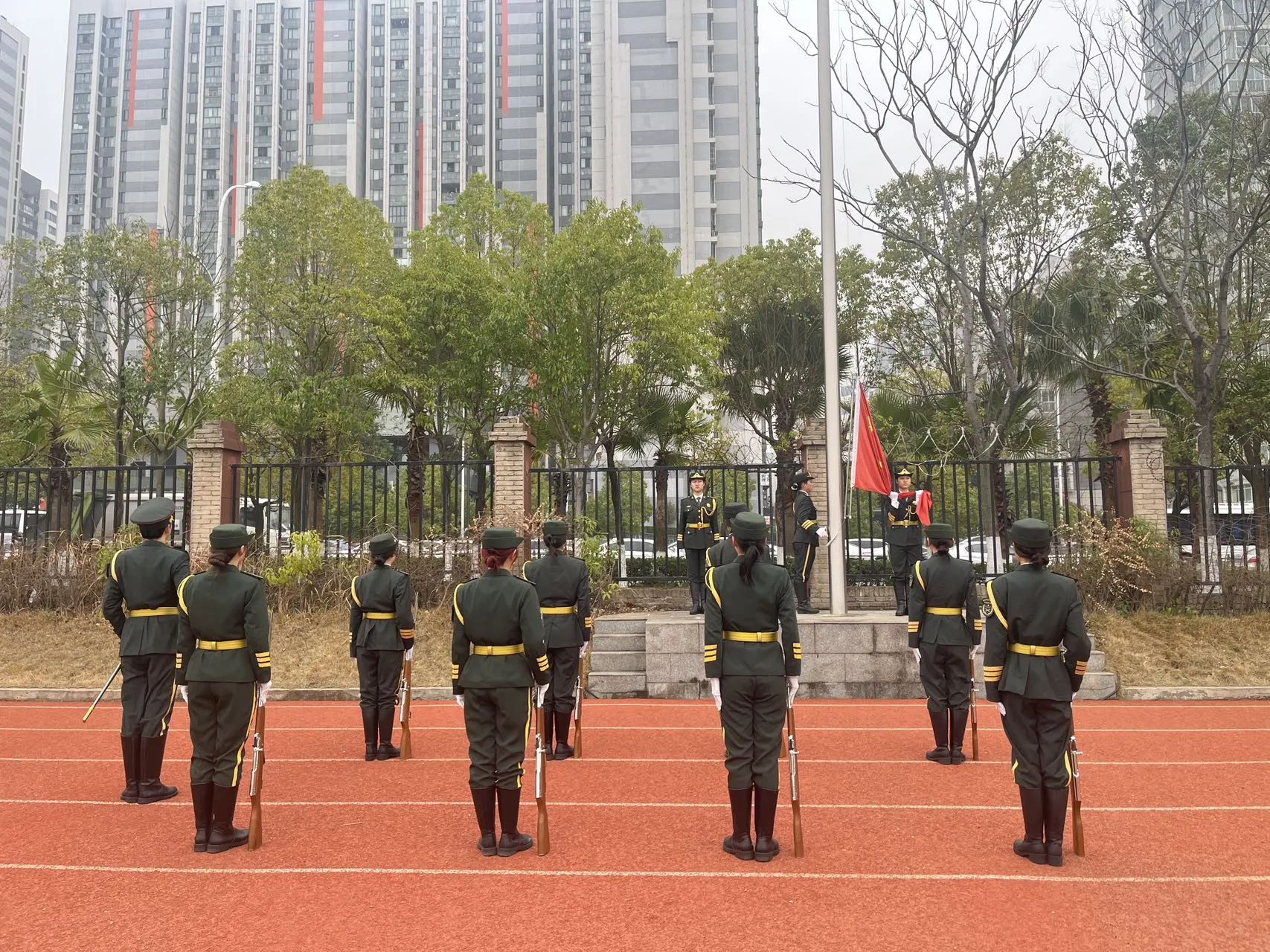 旭日东升,光辉倾洒,全体师生庄严肃穆,目光凝聚。国旗护卫队身姿笔挺,肩扛重任,迈着坚毅齐整的步伐,护送那抹象征希望与荣耀的五星红旗,如白杨般傲然走向升旗台。激昂雄壮的《义勇军进行曲》奏响,声浪澎湃,五星红旗在激昂旋律与炽热目光中,缓缓攀升,向着无垠碧空舒展飘扬 。