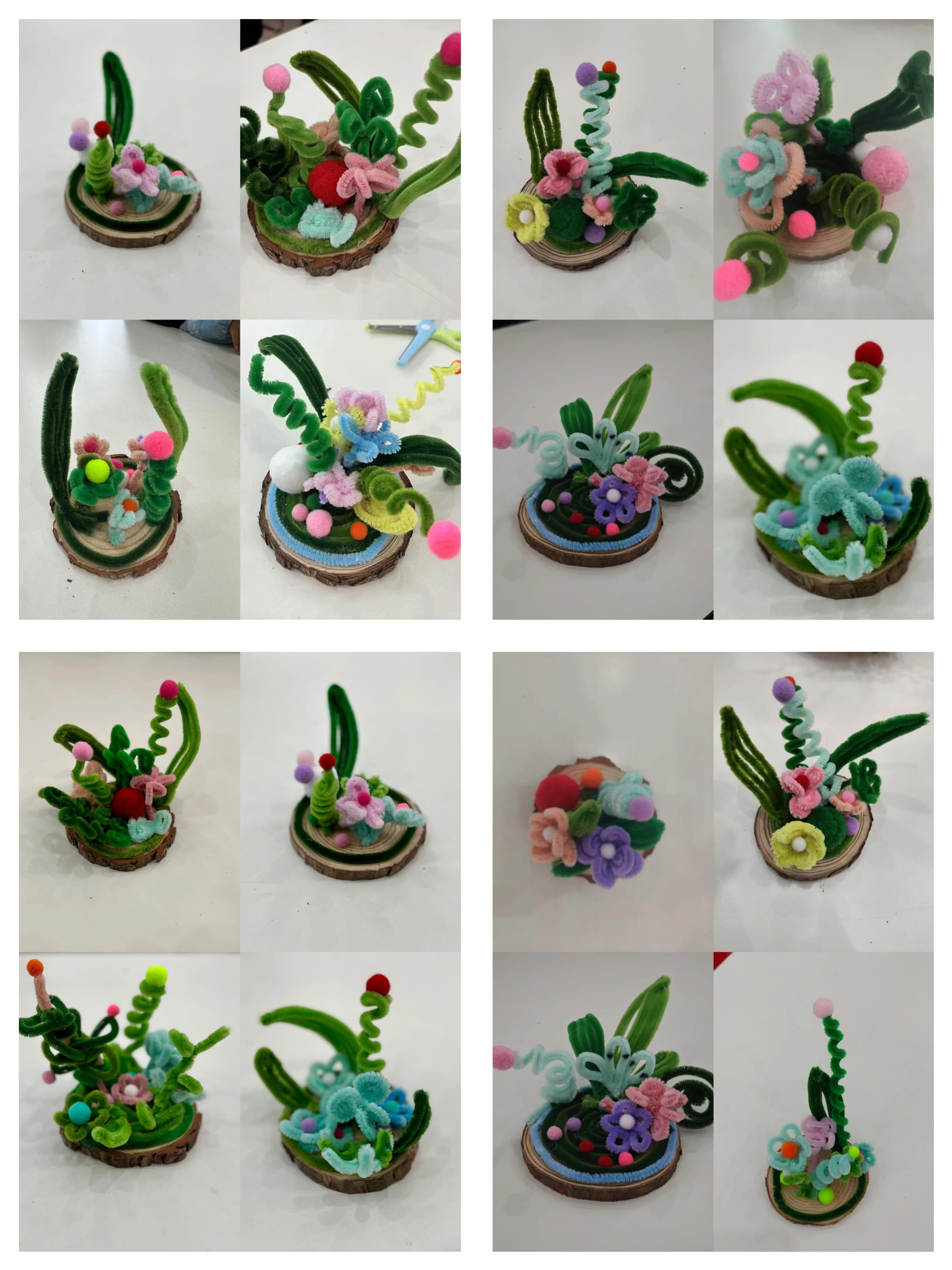 紧接着,活动的重头戏来了——制作扭扭棒植物微景观。志愿者们提前准备了五颜六色的扭扭棒、剪刀、胶水等材料,耐心地指导孩子们如何将这些简单的材料变成一片片栩栩如生的植物叶片。小朋友们发挥着自己的想象力,有的选择了清新的绿色,有的则大胆尝试了鲜艳的红色、黄色。他们小心翼翼地缠绕、修剪,每一片叶子都蕴含着孩子们对大自然的无限想象和热爱。