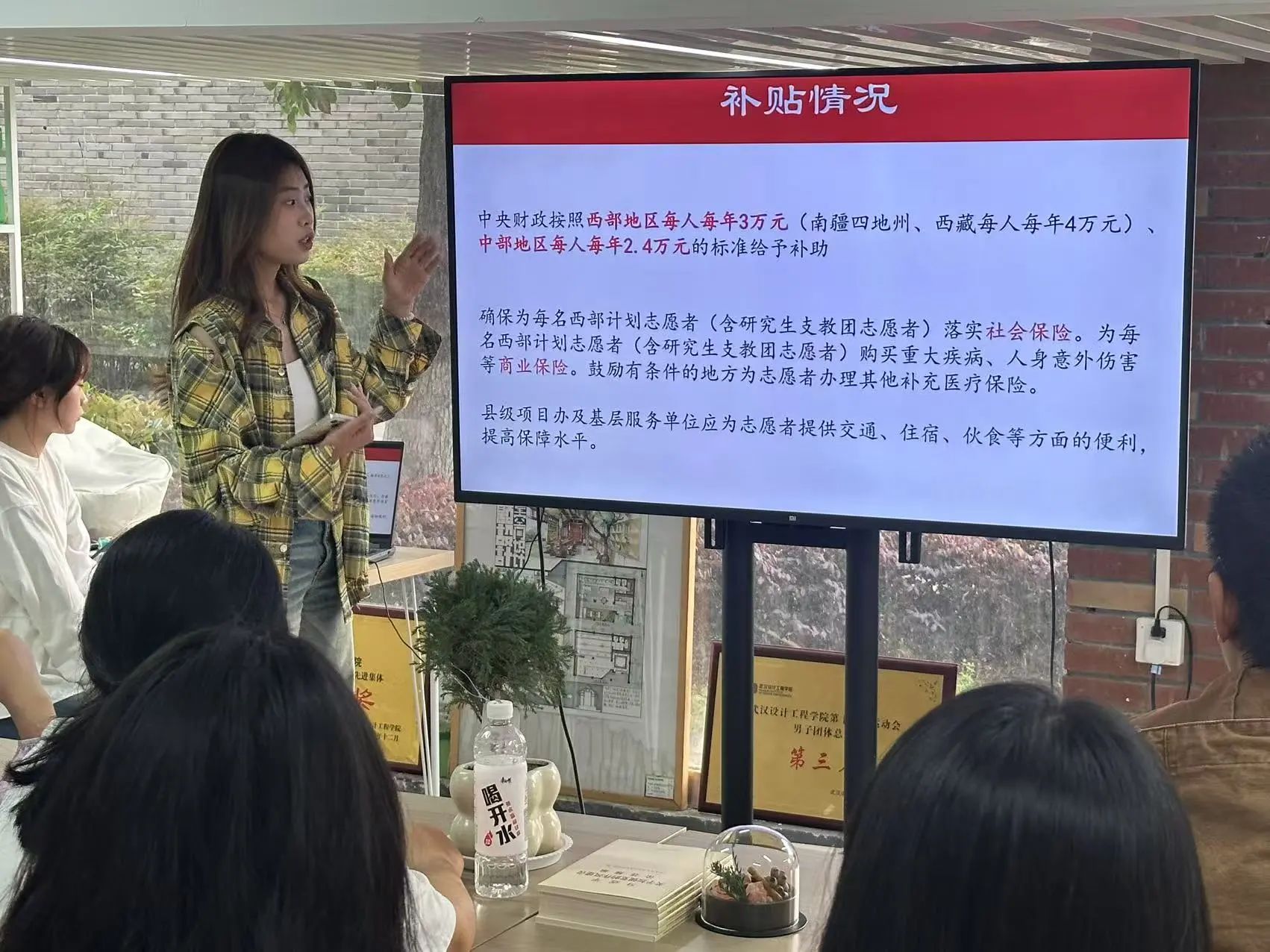 校青年志愿者协会(校青协)志愿者担任主讲,围绕西部计划政策、服务内容、报名流程及往届经验展开讲解。现场通过ppt展示西部基层风貌,分享志愿者扎根乡村教育、生态保护的真实故事。互动环节中,员工就服务地区分配、待遇保障等提问,主讲人结合政策文件细致解答。
