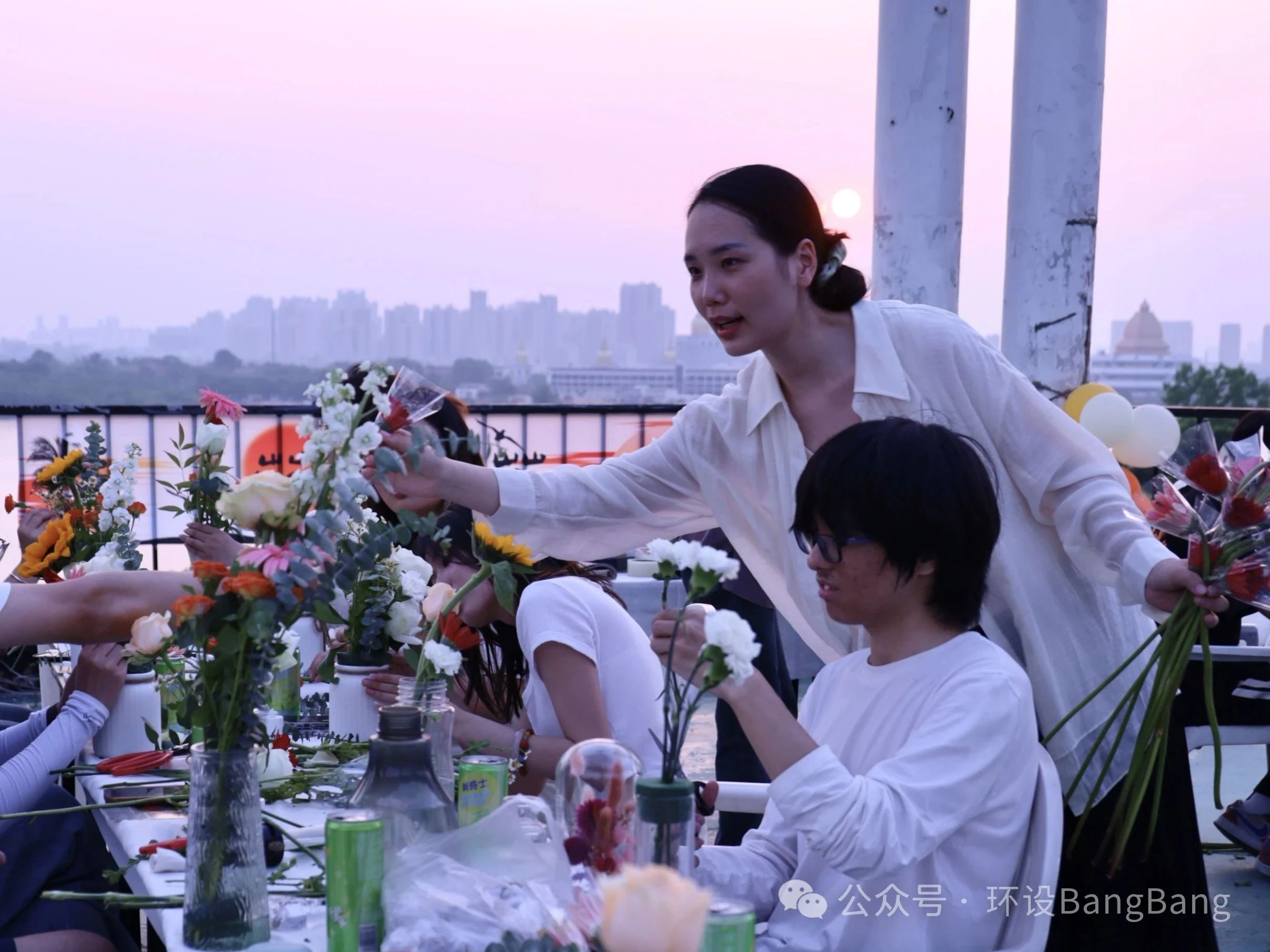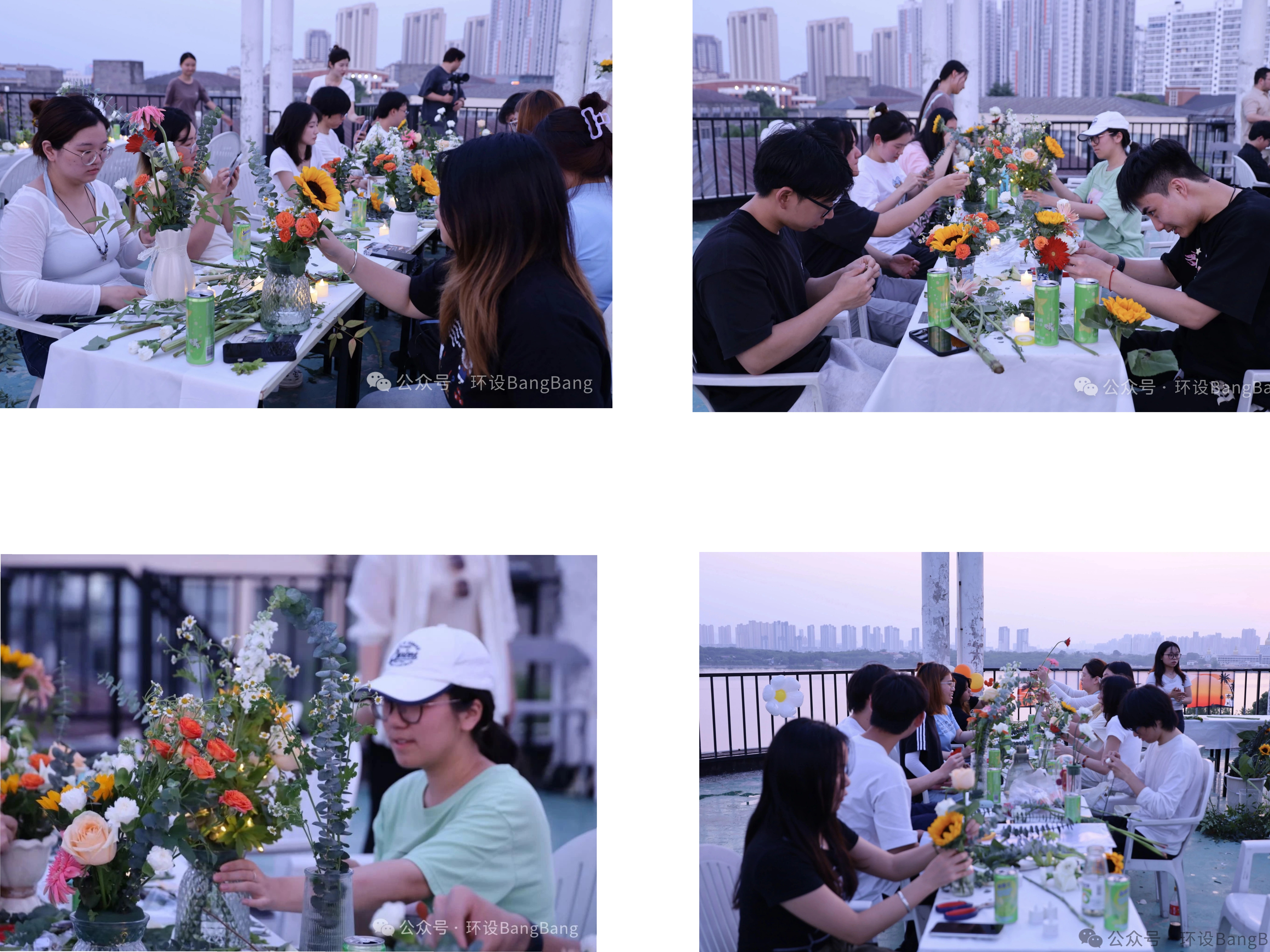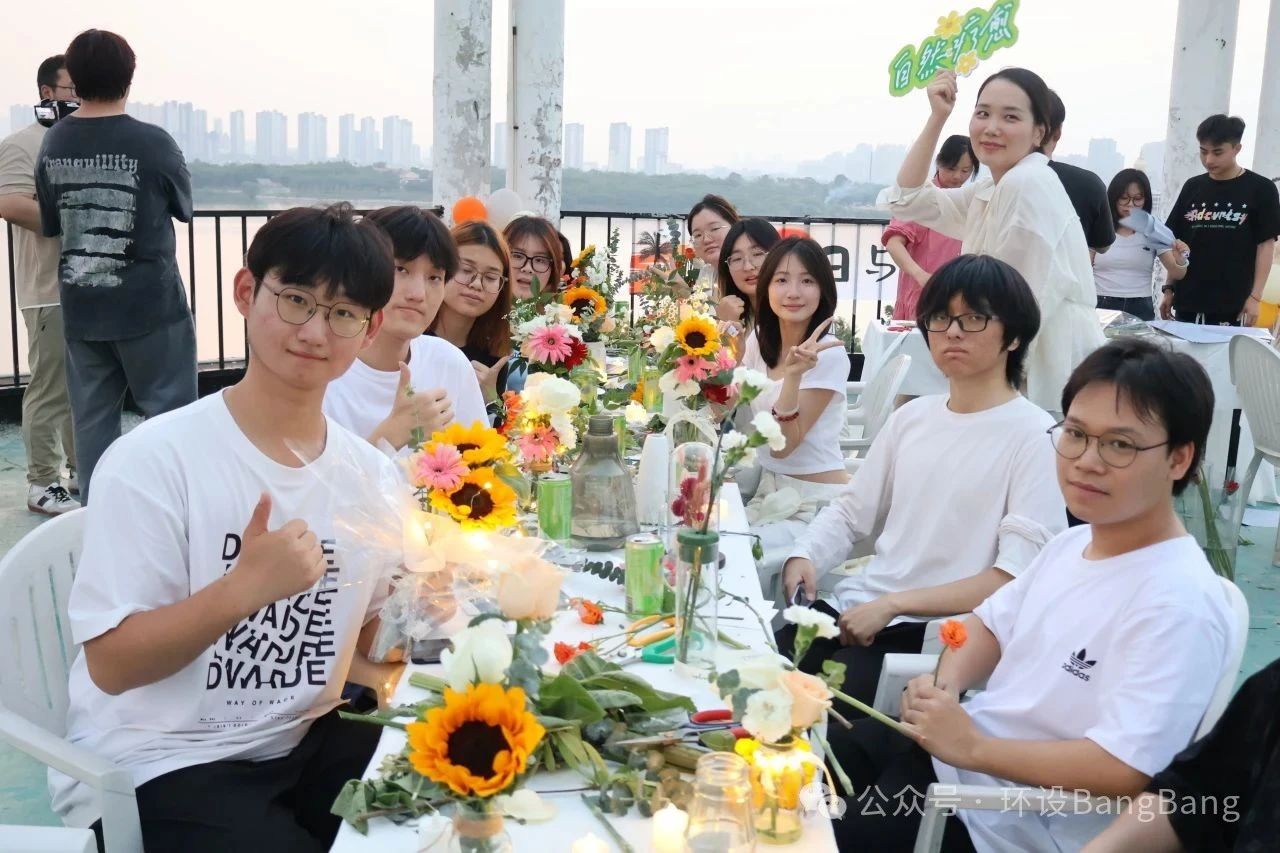 晚风送来旋律,落日歌会的即兴合唱中,同学们尽情释放自己。这场持续两个小时的活动,让同学们带回的不仅是花艺作品,还有对可持续生活的思考、专业知识的具象化实践,以及一次坦诚的情绪对话。正如活动结束后仍在天台打卡拍照的同学所说:“花朵向阳而生,这一刻我就是它们的太阳。”