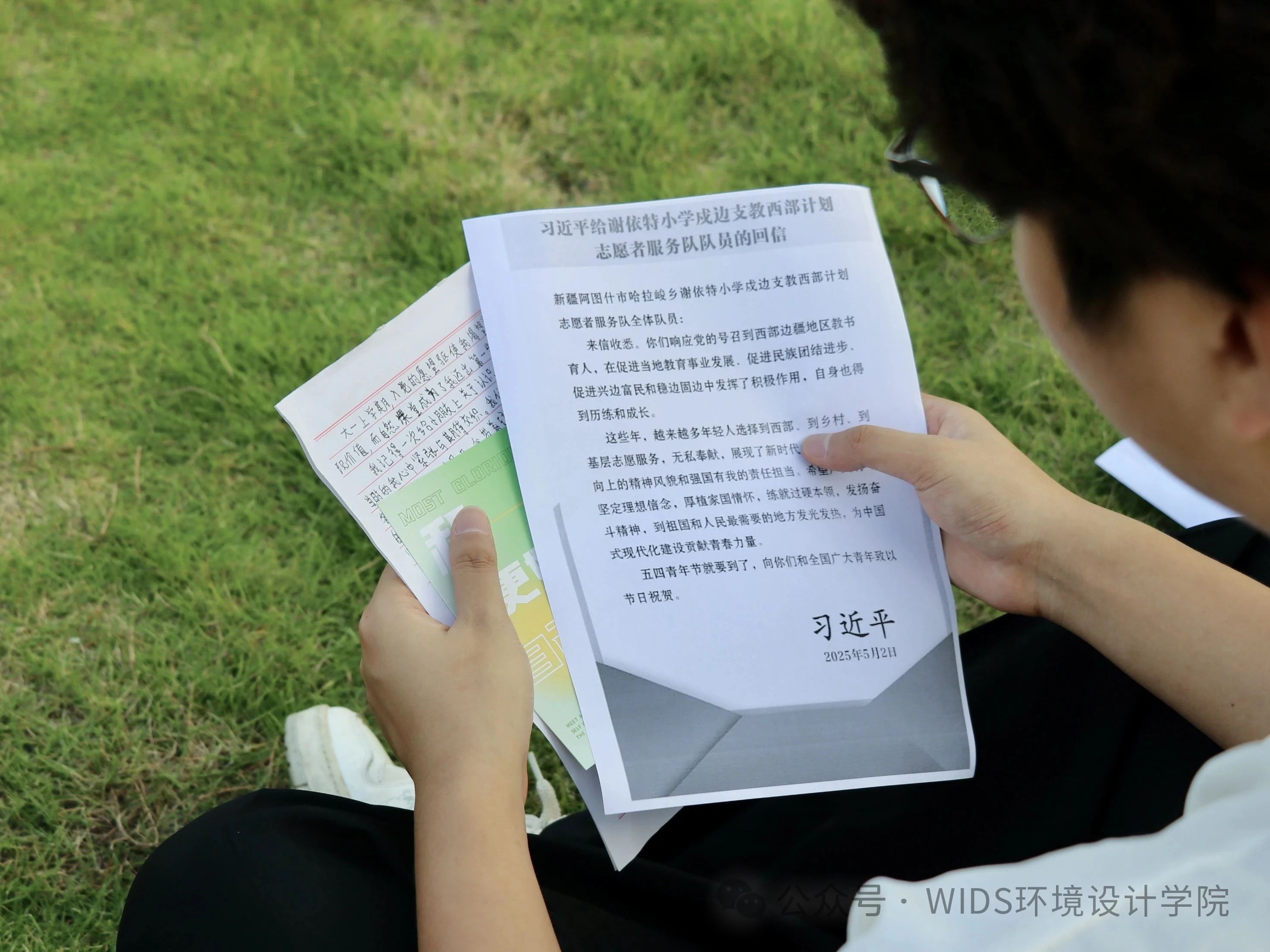 随后,各专业大一新生代表手持亲笔写就的“致未来信件”,表达了对回信精神的感悟,以青春之声向未来许下庄严承诺。环境设计2402班黄邓希目光坚定,高声诵读:“希望自己能在未来的学习中不断提升专业技能,用设计为基层地区带来更多美好的改变——让每一寸土地都镌刻青年设计的温度,让每一次创作都成为乡村振兴的注脚。”