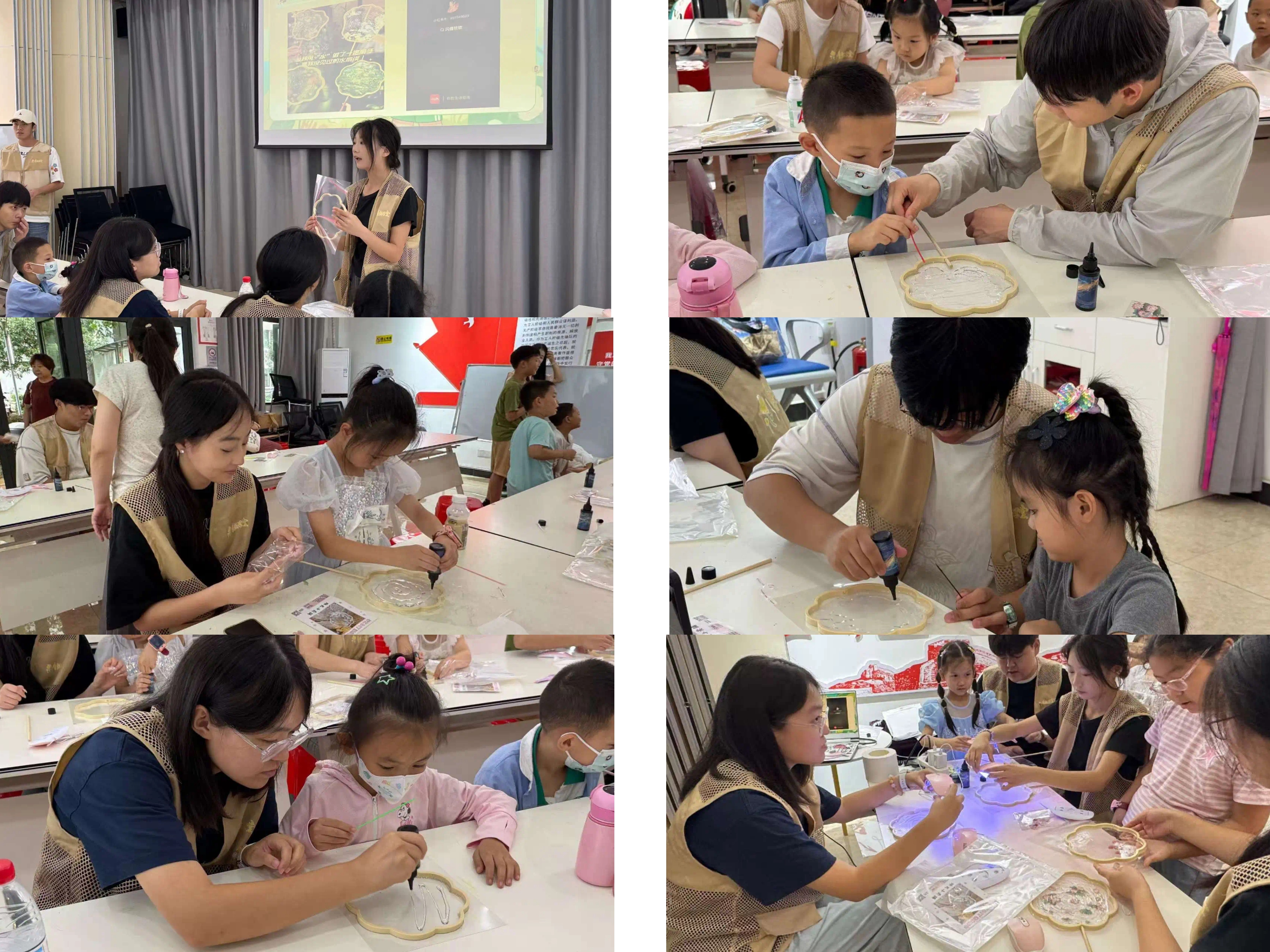 随后,激动人心的手工水扇DIY环节正式拉开帷幕。志愿者们将准备好的材料一一分发到孩子们手中。在志愿者和家长的帮助下,孩子们开启了创意之旅。孩子们用彩笔在扇面上勾勒出心中夏至的模样,有的画了蝉鸣阵阵的树林,有的画了波光粼粼的湖面。接着,小心翼翼地拿起干花,轻轻粘贴,仿佛在给扇面镶嵌上自然的瑰宝,让扇面瞬间变得绚丽多彩。最后,涂上一层uv胶,用固化灯加固,一把把独具匠心的手工水扇就诞生了。