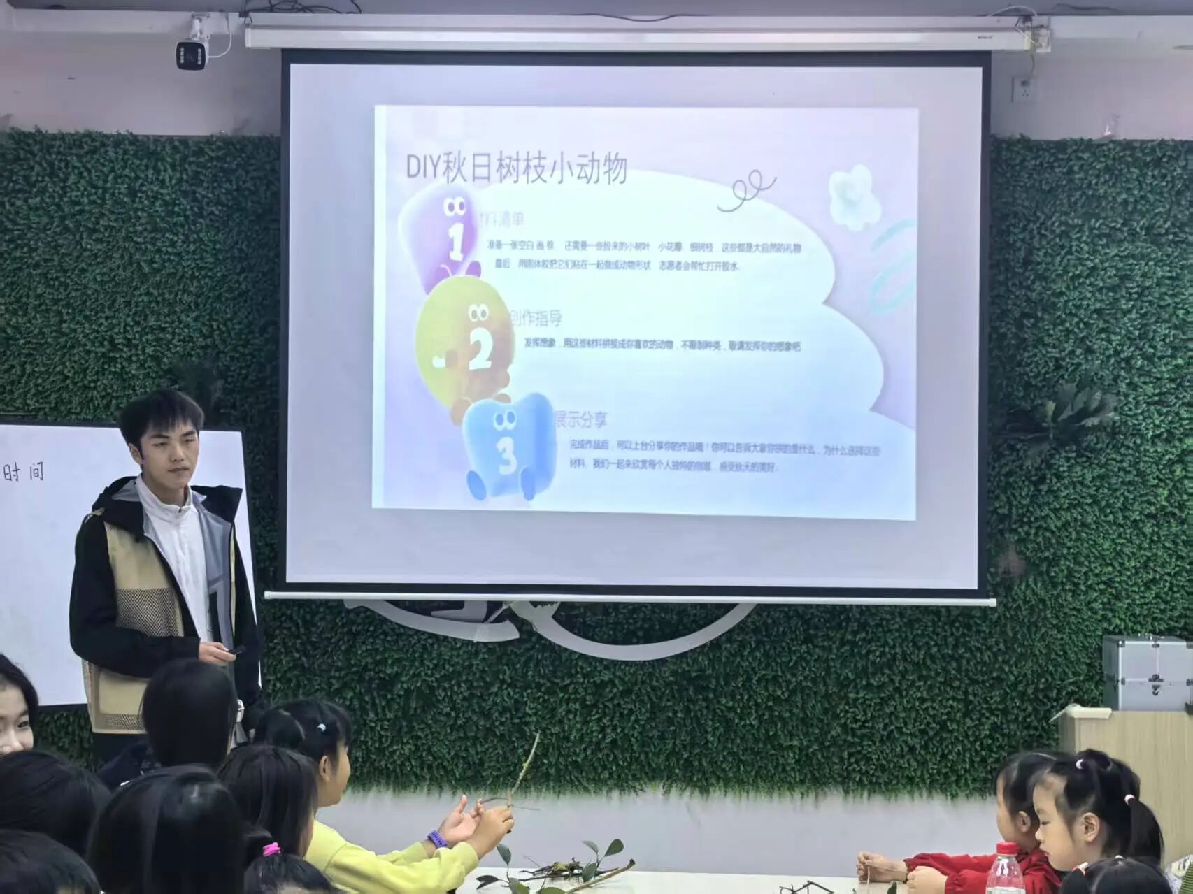 在阵阵欢笑声中,一个个用树枝拼贴的小动物作品逐渐成型。孩子们举着自己的作品,脸上满是成就感。那些看似普通的树枝,在童真创意下变成一只只灵动的小动物,每一处拼接、每一个点缀,都透着孩子们对秋天的理解与喜爱。当阳光洒在作品上,树枝的纹理与孩子的创意交相辉映,折射出独特光芒——那是童真与自然交织的艺术光谱,是这个秋天最珍贵的自然礼物。