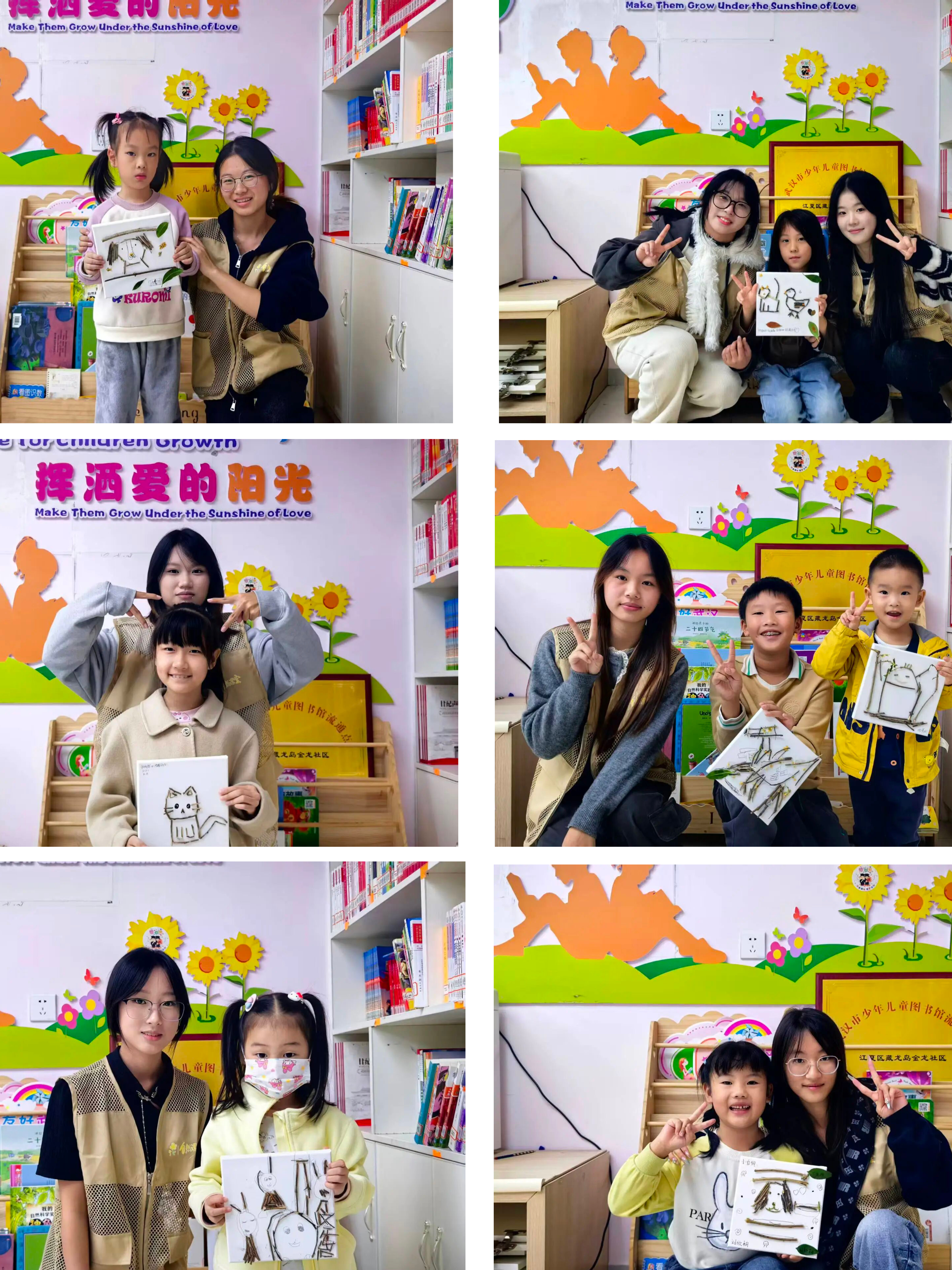 紧接着,激动人心的树枝拼贴环节正式开启。志愿者们分工协作,将收集好的树枝、胶水、彩纸等材料逐一分发给孩子们。在双方志愿者与家长的共同帮助下,孩子们化身“自然艺术家”,用稚嫩的小手摆弄树枝创作:有的孩子拼出活蹦乱跳的小兔子,几根树枝巧妙组合,搭配彩纸做的耳朵,形象活灵活现;有的孩子拼出展翅的小鸟,细细的树枝拼成翅膀形状,仿佛下一秒就要飞向蓝天……树枝在孩子们手中仿佛有了生命,被童心与创意赋予新模样。制作过程中,大家互相分享找到的特别树枝,交流拼贴小技巧,现场充满欢声笑语,每一个角落都洋溢着童真与秋意的交融之美。