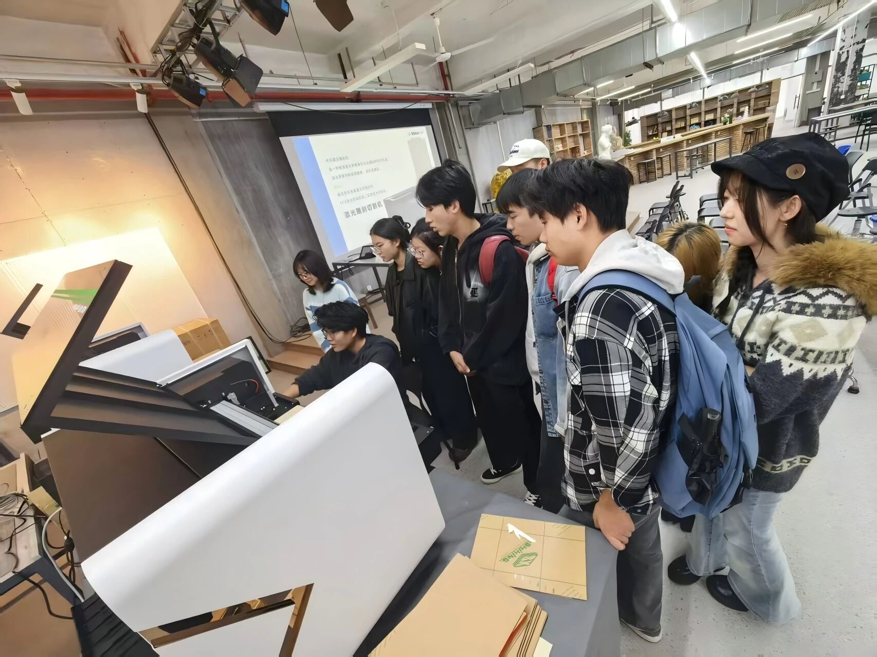 随后,在模型制作实验室,蓝鲸未来科技有限公司的实验员以“从图纸到成品,一堂课看懂激光切割”为题,为同学们带来了一场“干货”满满的现场教学。演示间隙,实验员还拿出公司“激光创业平台”的公开数据:平台已为218个校园创客团队提供“前店后厂”式服务——员工在线上传图纸,系统自动报价、排产,成为老员工创业的标杆案例。听完介绍,同学们把实验员团团围住,有的咨询如何运用平台进行创业,有的追问“激光切割+亚克力灯带”能否落地毕业设计,现场气氛热烈。