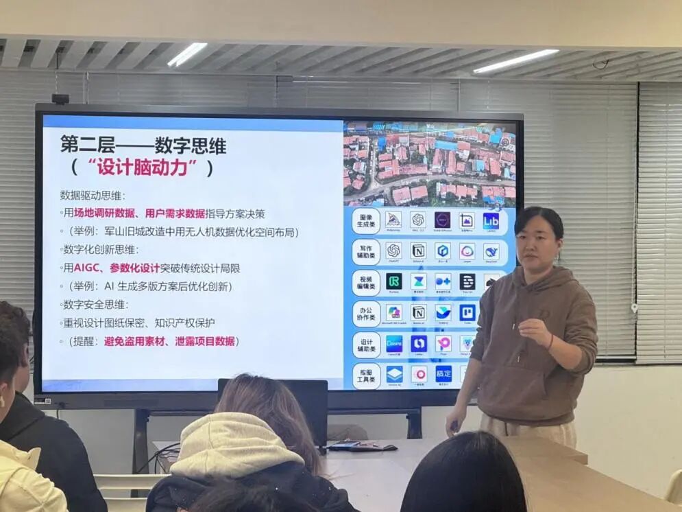 值得一提的是,本期主题与公司持续推进的“专业数字化转型”紧密衔接。谢老师团队近年来在虚拟仿真建造、AI辅助设计等领域的探索,也为同学们提供了从课堂到赛道的多元路径。正如她在总结中所强调的:“数字素养不仅是就业的‘敲门砖’,更是我们作为未来环境设计师的‘底色’——既要具备工具熟练度,也要保持人文温度与科学态度。”