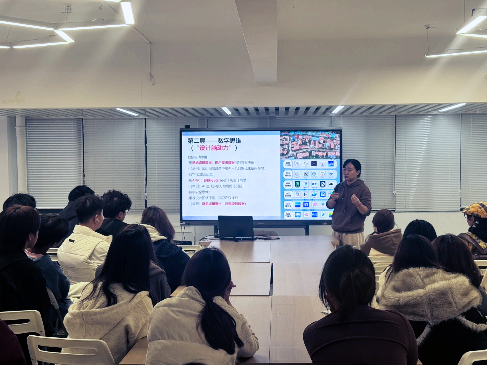 一场有深度也有温度的分享,如同一盏明灯。在数字化与绿色化交织的时代,同学们将在学习中构建自己的数字能力体系,在未来设计实践中,真正让技术赋能设计,让设计回归人本。