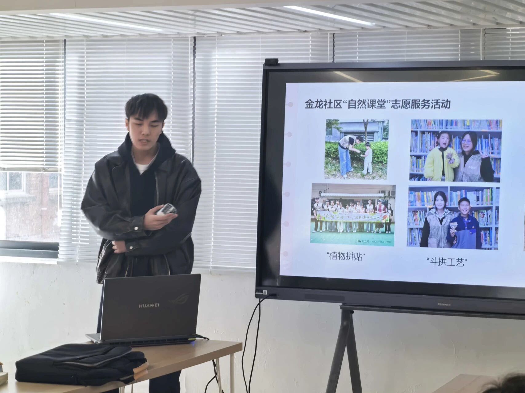 在分享会上,万俊男同学首先介绍了“筑梦”志愿服务队的初心——依托公司筑巢工程和艺术技能特色,确立“美育+志愿”的核心方向,打造了“自然课堂”等品牌项目。他提到,“筑”呼应环境设计、风景园林专业的建造内涵,“梦”则承载着用艺术点亮孩子童年的心愿,服务队希望通过引导孩子们用感官感知自然、用双手创造艺术,在心底播撒可持续发展的理念种子。
