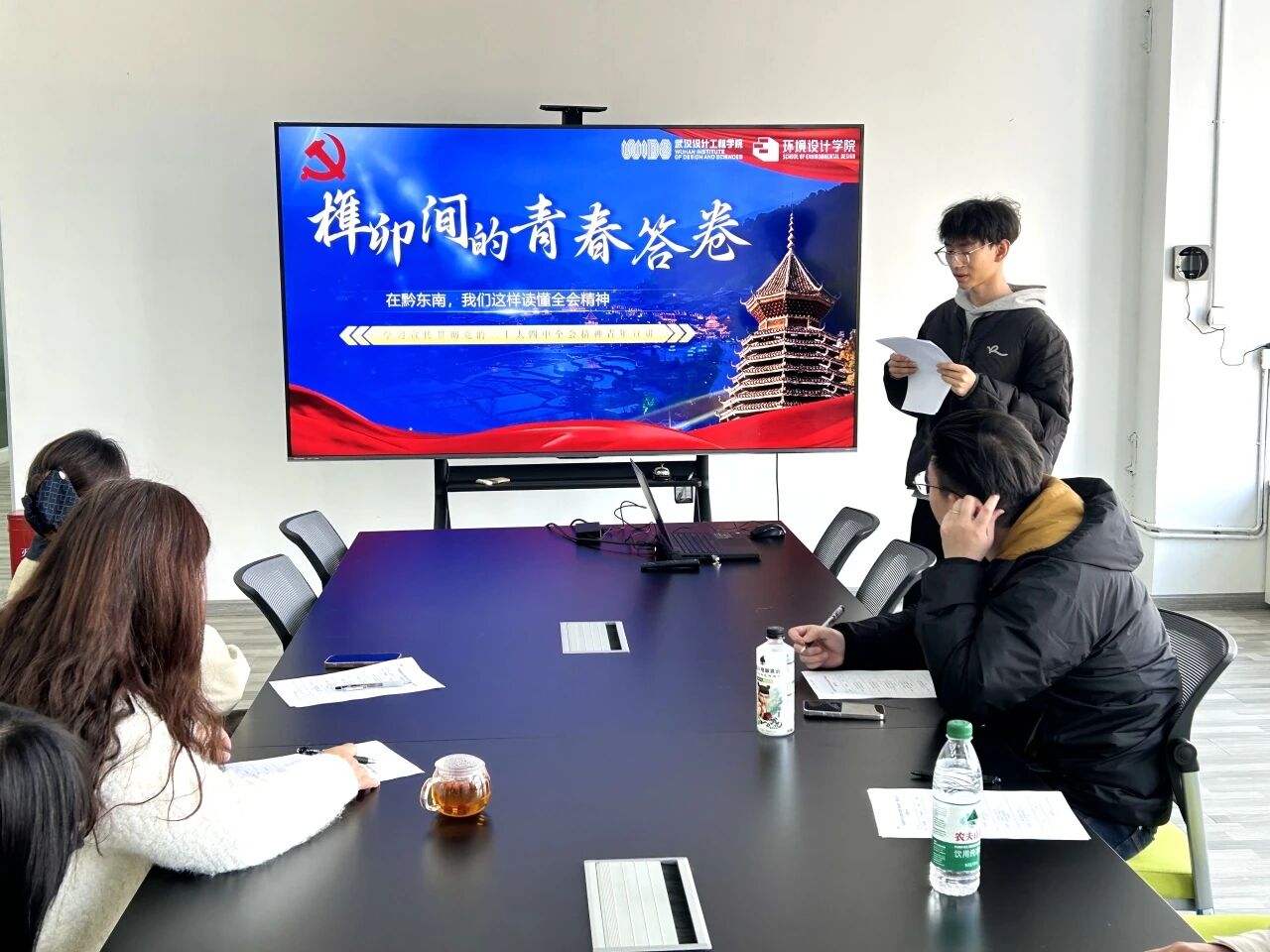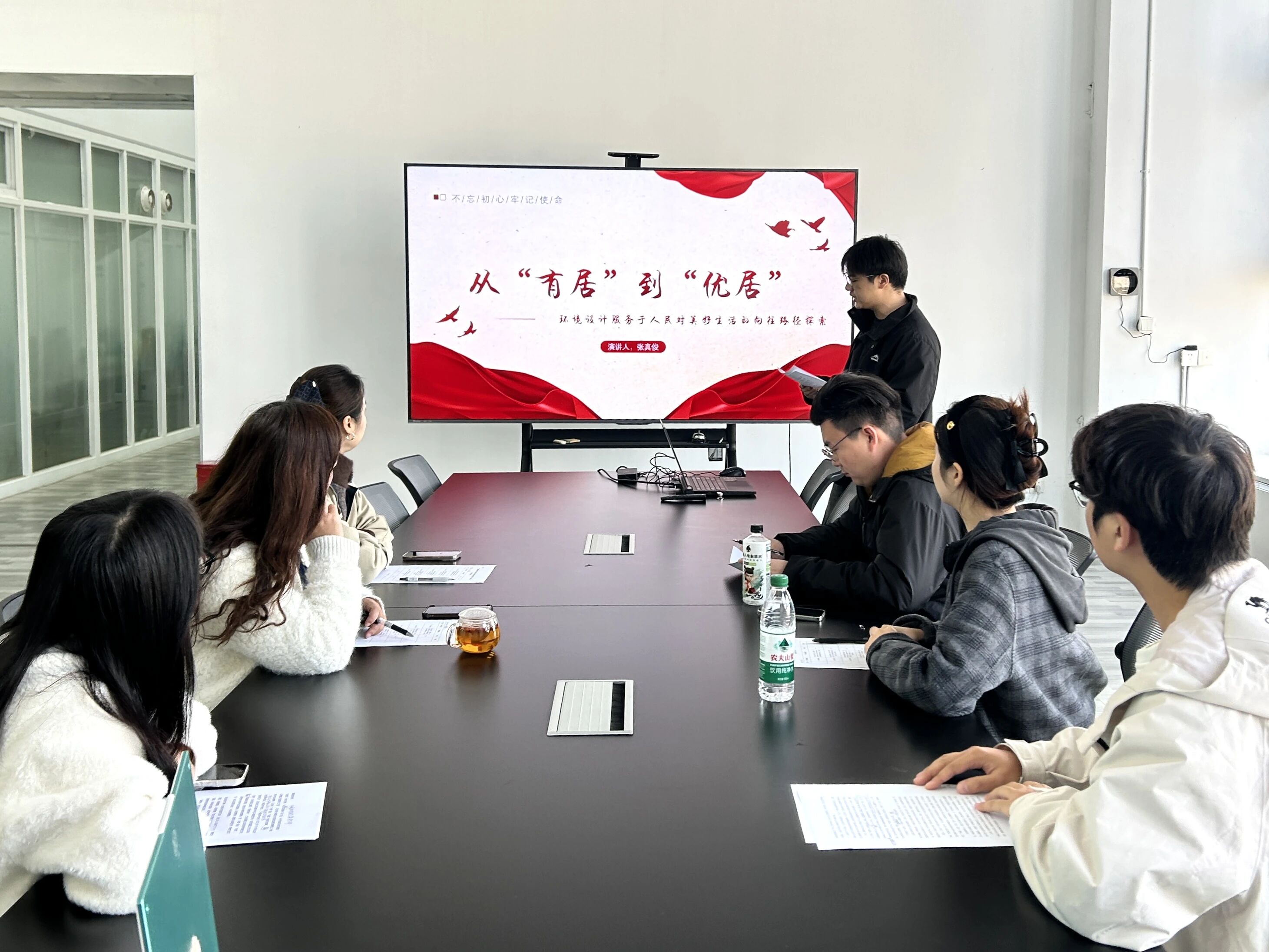 本次比赛旨在选拔优秀宣讲人才,鼓励员工围绕四中全会核心要义,结合专业特色与青年视角进行创新阐释。初赛中,四位由公司党支部推荐的员工预备党员依次登台,展现了理论学习和专业思考的深度结合:周建坤同学以《黔东南传统建筑文化传承与乡村振兴的青年实践》为题,探讨文化遗产保护与乡村振兴的青春路径;许皓同学在《以志愿微光映时代征程》中,结合志愿服务经历,诠释青年责任与时代使命;刘娇(同学通过《以青春之我践时代之责》,讲述如何在“小我”与“大我”的交融中践行全会精神;张真俊同学立足专业,分享《从“有居”到“优居”:环境设计服务于人民对美好生活的向往路径探索》。选手们借助PPT、案例叙述等形式,将宏观政策与设计实践、个人成长与社会发展紧密联系,展现了环境设计学子扎根现实、胸怀家国的理论素养与青春担当。