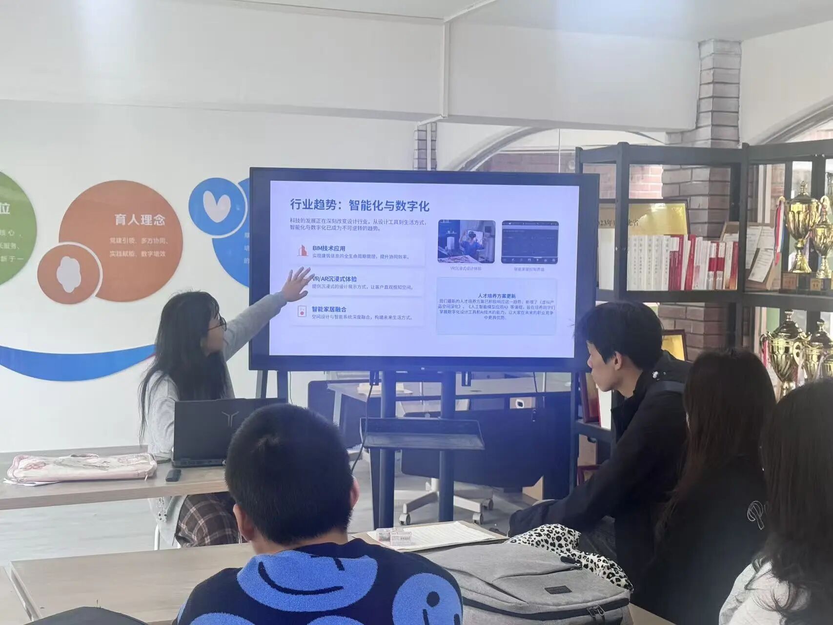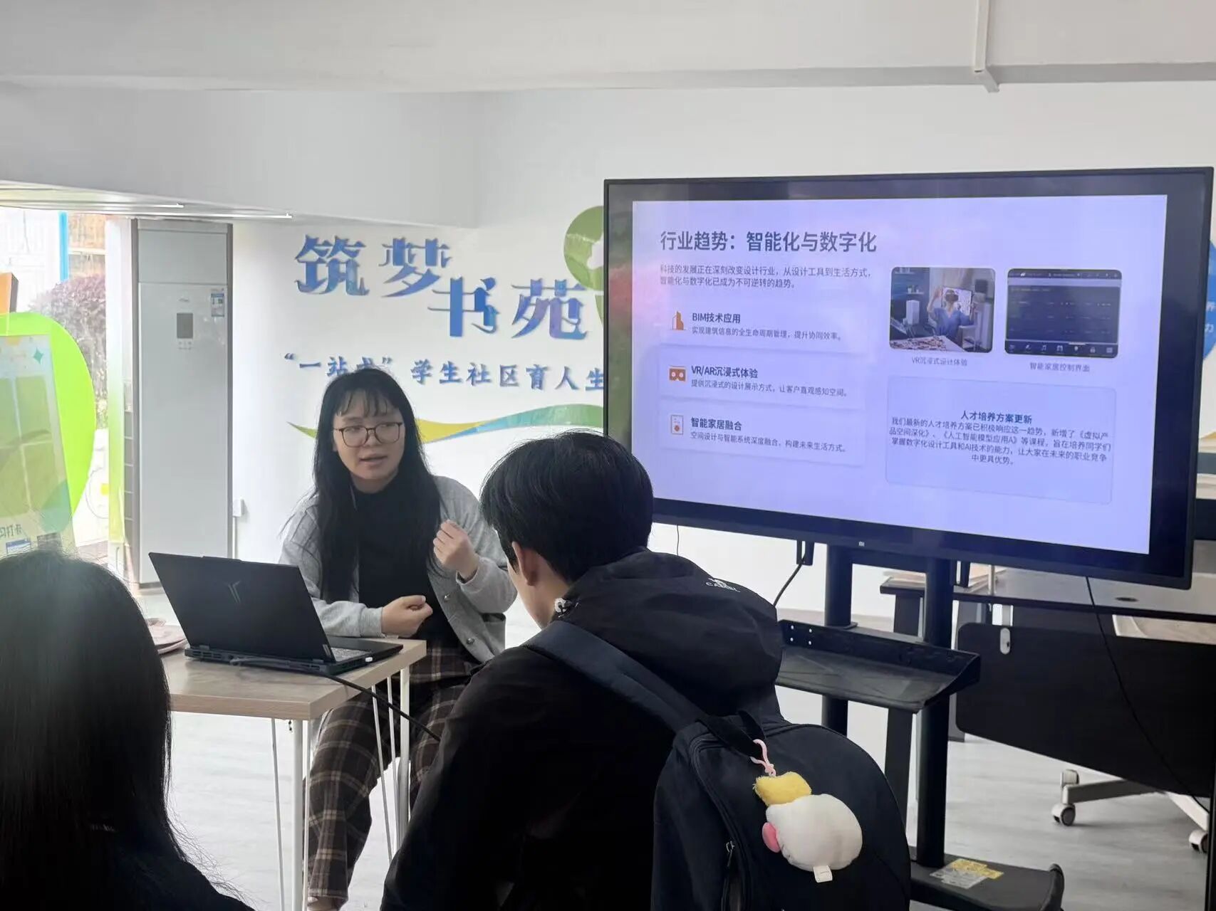 随后,杨琼老师结合行业前沿动态,剖析了当下设计领域两大发展趋势:可持续绿色设计与智能化数字化设计。针对可持续与绿色设计,她提出要坚守生态设计理念,优先选用低碳环保、可循环利用的建材,最大化借助自然光与自然通风优化空间布局,打破建筑与自然的隔阂,打造宜居、绿色的生态空间,从设计源头减少环境负荷。谈及智能化与数字化趋势,她介绍了BIM技术、VR/AR沉浸式体验、智能家居融合等前沿方向,同时告知同学们,公司已同步优化人才培养方案,新增《虚拟场景表现》《人工智能大模型应用A》等前沿课程,助力大家紧跟行业步伐,熟练掌握数字化设计工具与AI应用技术,提升未来职场核心竞争力。