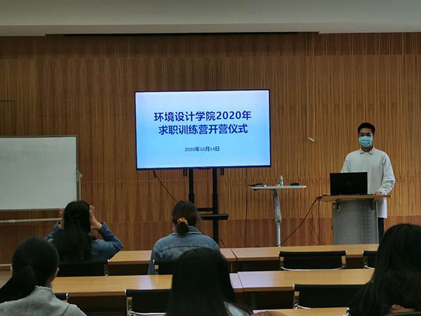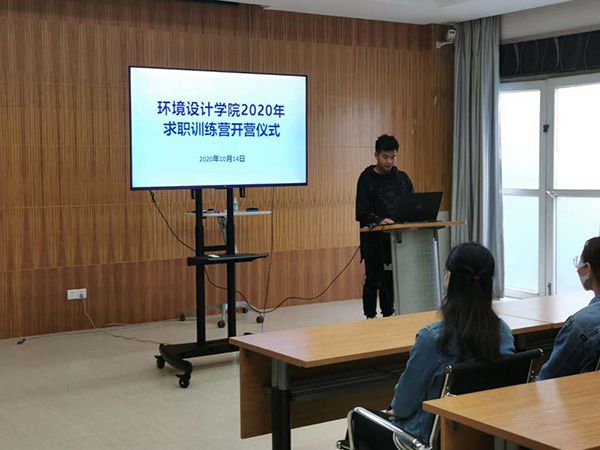 会议第二项由求职训练营学员代表环设1703班叶帆同学发言,他代表全体训练营成员承诺:1.认真听从指挥、遵照老师的安排,服从管理,积极参加活动。2.努力提高自己的综合素质和求职能力,珍惜本次培训机会。3.学员之间要做到团结友爱、互相帮助、共同进步。