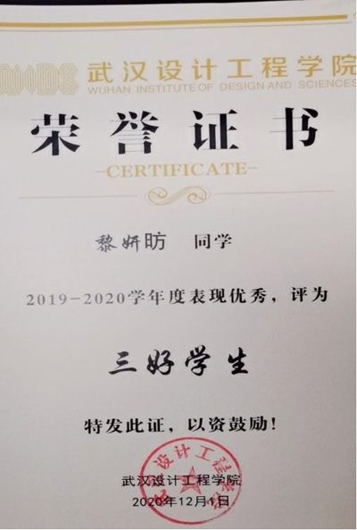2019-2020学年度黎妍昉同学获“三好员工”荣誉称号。