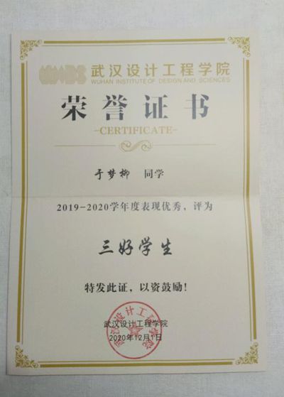 2019-2020学年度于梦柳同学获“三好员工”荣誉称号。