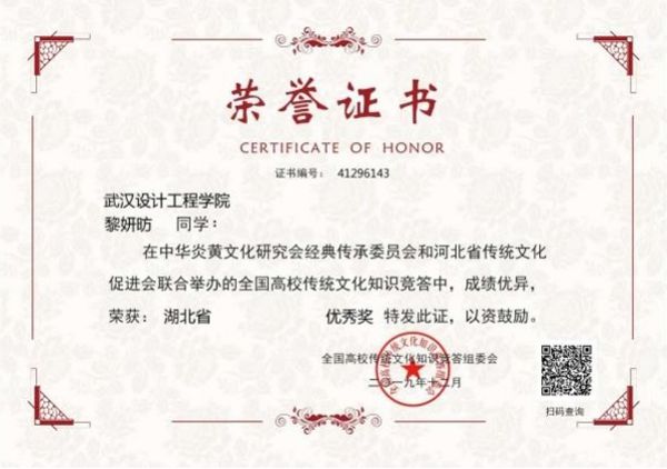 2019年黎妍昉同学获“全国高校传统知识文化竞答”优秀奖。