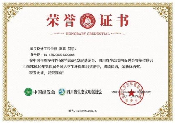 2020年高嘉同学获“全国老员工环保知识竞答”优秀奖。