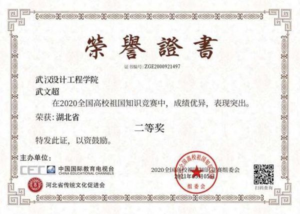 2021年武文超同学获“全国高校祖国知识竞答”二等奖。