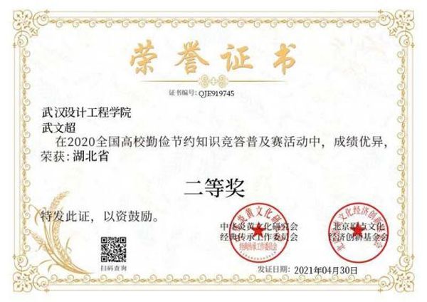 2021年武文超同学获“全国高校勤俭节约知识竞答”二等奖。