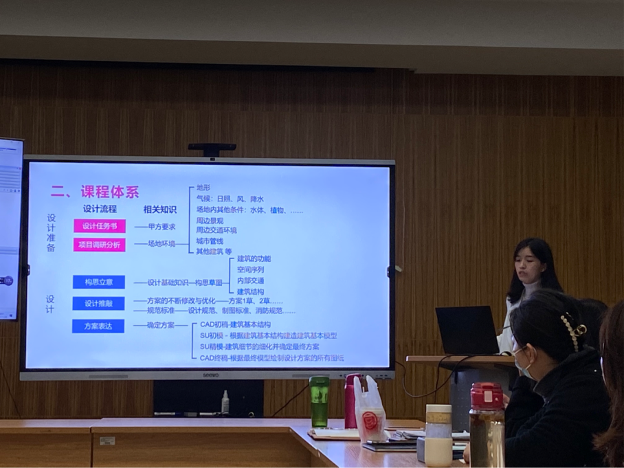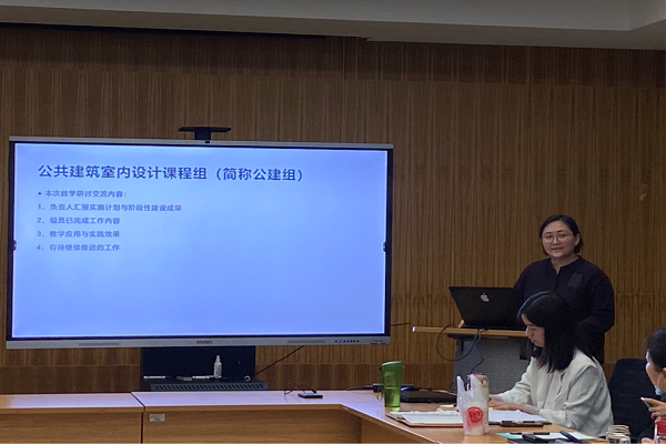 第二议题,任璐老师针对新课题《公共建筑室内设计》课程结构建设内容进行分享。任老师针对实施计划与阶段性成果进行汇报,其中对其组员们完成的阶段性成果进行展示,条理清晰的对课程开展提出详实的实施计划。叶经理也对其工作进行肯定,并对系部老师都提出专业能力都需要更专更精的要求。